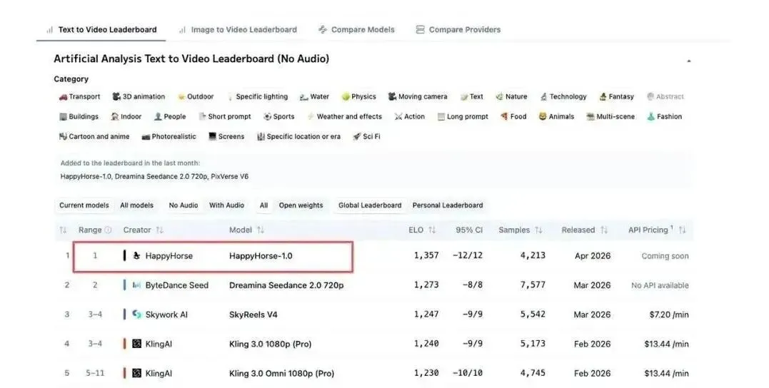 4月7日,全球权威AI视频盲测平台Artificial Analysis的榜单更新,一个从未出现过的名字——HappyHorse-1.0——空降榜首。在文生视频(无音频)赛道,它以Elo 1379分领先字节跳动Seedance 2.0整整106分;在图生视频(无音频)赛道,更是跑出了1411分的全平台历史最高分,将此前稳坐榜首数月的Seedance 2.0彻底拉下王座。