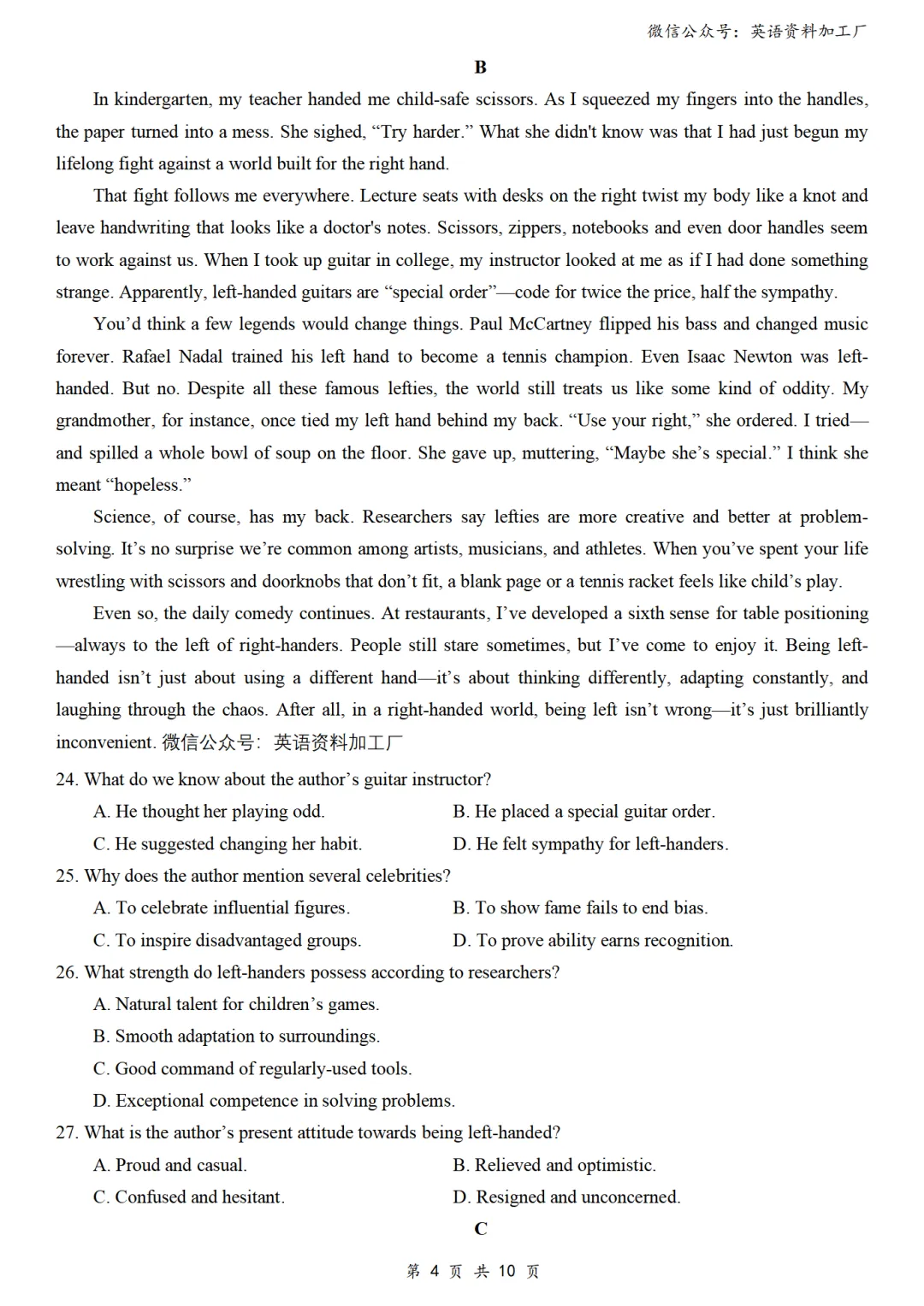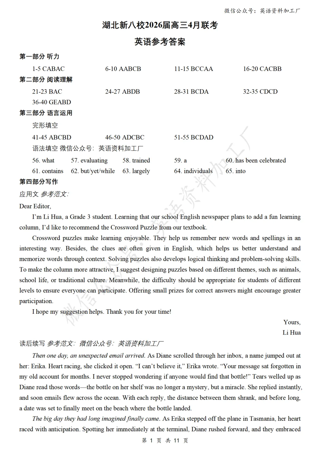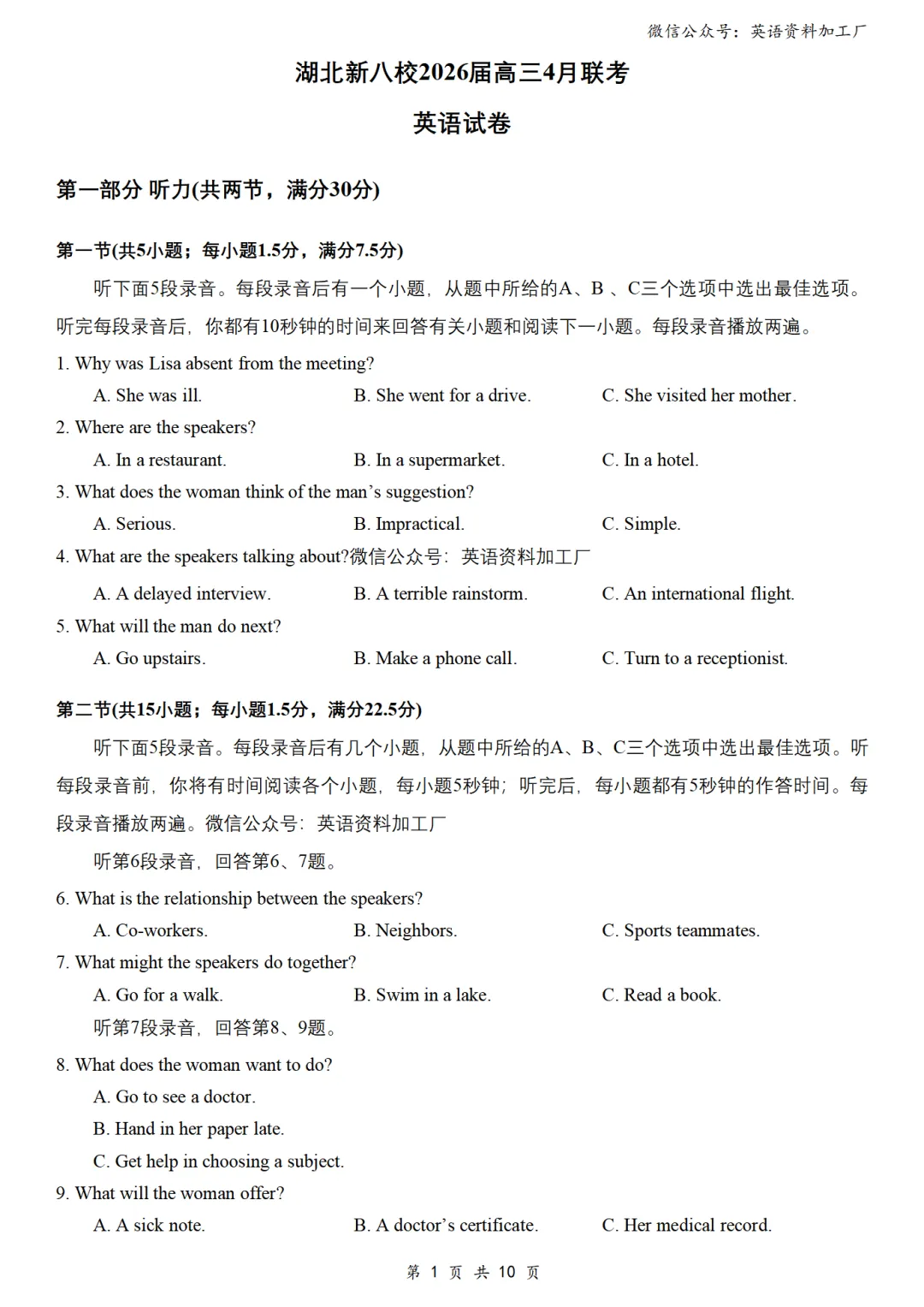 【26届试卷】免费下载!湖北新八校高三4月联考英语试卷+答案解析+听力(有Word+pdf版)