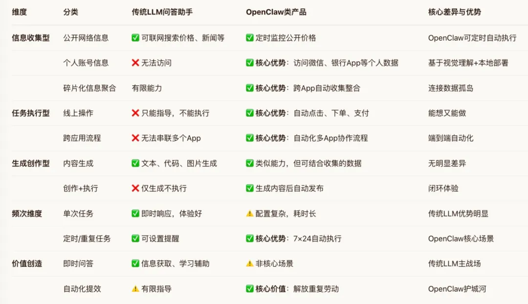 “Openclaw”产品和传统的llm问答助手的在场景优势上的最大区别是什么,首先场景分类为信息收集型、任务型、生成创作型,这三种类型都可以在场景中进行组合,比如我想全网比价一下xx小区点星巴克抹茶拿铁大杯哪个平台买最便宜,是淘宝闪购还是美团,这就是典型的单一信息收集型。如果我在这个基础上又加上指令,比价完,哪个便宜,帮我下个单,这个就是信息收集+任务型,当然,单纯任务型的场景也是存在的,另外,典型的生成创作类的,比如根据今天天气生成一首歌曲。