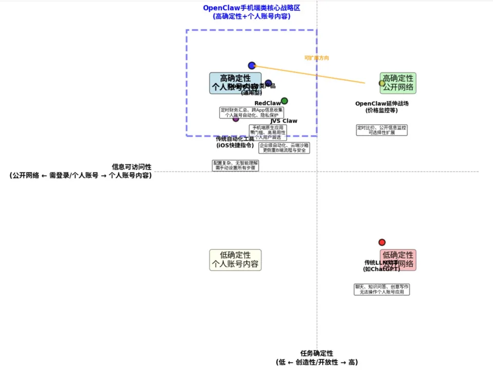 那么从分类和频次维度,“openclaw”类产品到底适合什么呢,笔者体验了redclaw和jvs claw两个比较典型的手机端侧的“openclaw”类产品,比如在信息收集型场景中,“openclaw”类产品和传统的llm问答助手产品最大的差异在本地化部署和基于视觉理解,传统的llm问答助手能够联网搜索,比如进行奶茶价格全网比价,但是无法做的比如用户说,我是个运营,我要每天看我企微信的群聊信息,统计群聊里用户对某个产品的情感偏好、购买意向。而在任务型场景中就更典型了,“openclaw”类产品不仅会想还能做,而传统的llm问答助手只能回复一段文字,告诉你去哪里点,不能真的帮你点奶茶。在生成创作型场景中,目前感觉“openclaw”类产品和传统的llm问答助手产品没有明细区别。