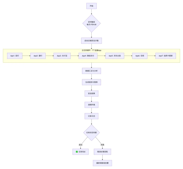 <br>开始 → 定时触发 → 循环7个App<br> ↓ ↓<br> 云手机启动 → 登录App → 导航到账单页<br> ↓ ↓<br> 安全验证 → 视觉识别UI元素<br> ↓ ↓<br> OCR提取数据 → 数据验证<br> ↓<br> 所有App完成? → 是 → 数据汇总分析<br> ↓ ↓<br> 否 生成报告<br> ↓ ↓<br> 下一个App 邮件发送+清理<br> |