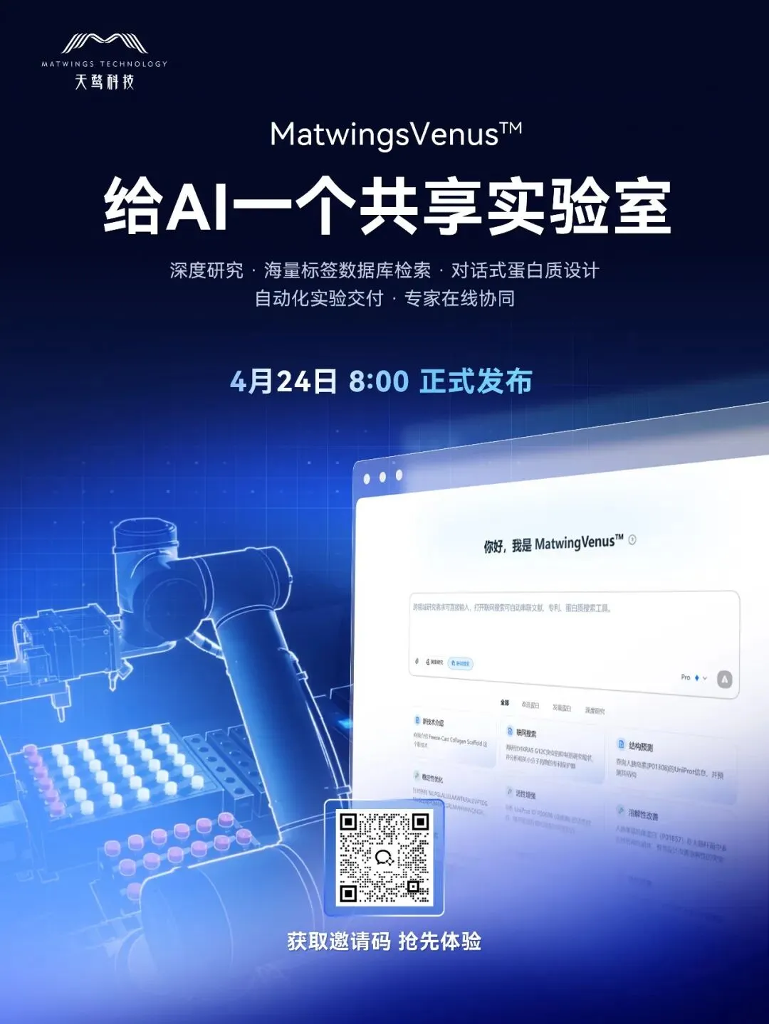 以自研蛋白质大模型为核心引擎,天鹜科技开发科研智能体与自动化实验装置,打造了 AI 蛋白质研发全栈式平台:从市场/文献/专利调研,到分子设计、小试验证、中试工艺优化,直至生产放大。通过AI全面走进产业应用场景,突破现有人类专家的认知边界,更快更好地开发以蛋白质为底层芯片的各类生物产品,如创新药、大健康、农业、功能食品、生物基材料等。