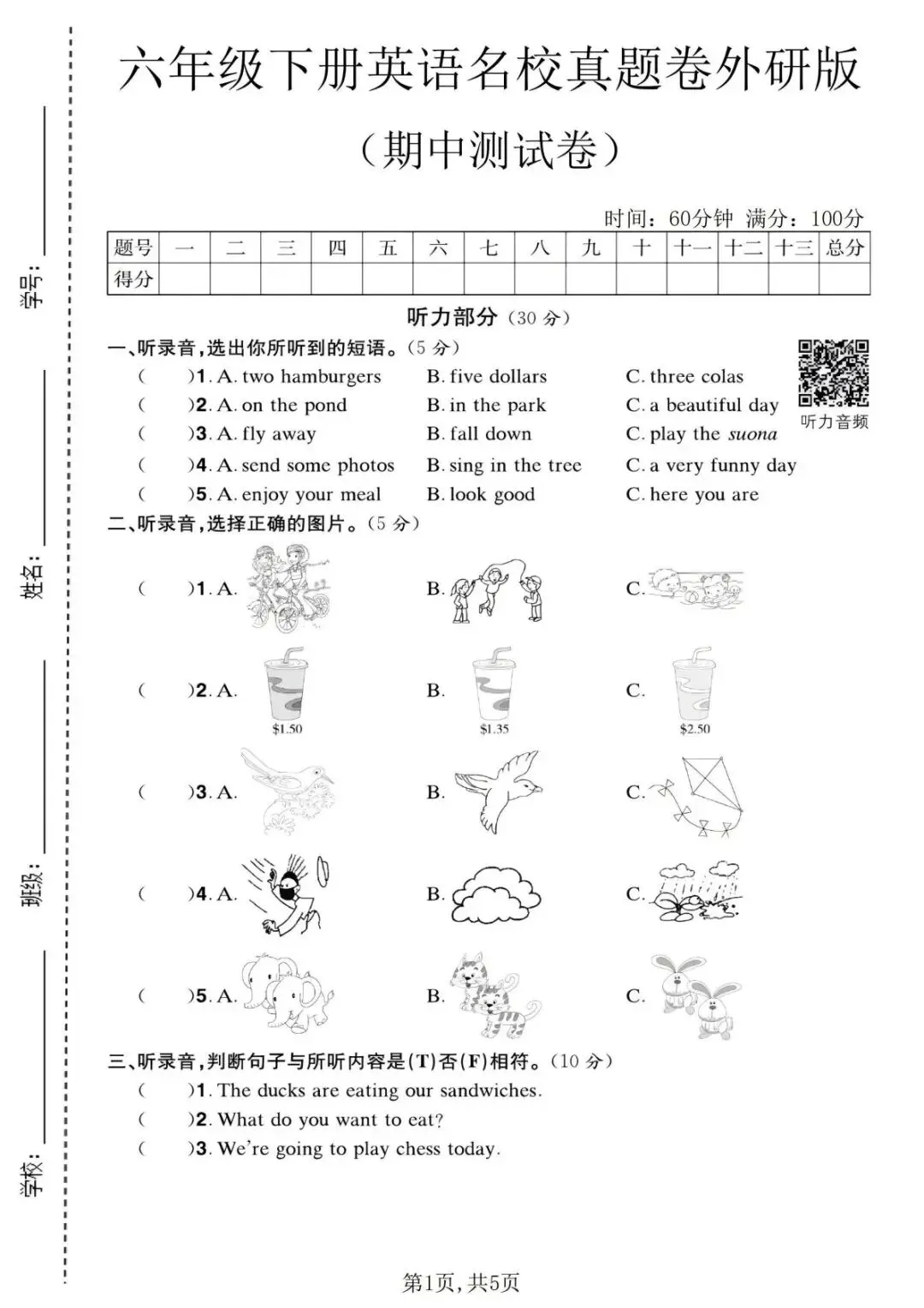 ✅六年级(下)英语 期中真题测试卷《外研版》