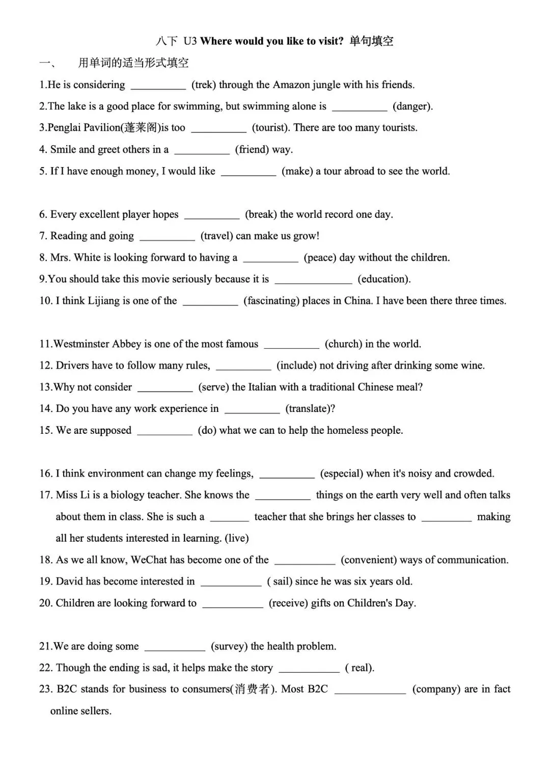 鲁教版八下英语-U3单句练习(可打印) 点击蓝字,关注我们 【其他合集】 用英语讲中国故事 | 《你好中国》Hello,China 100集(全) 2025鲁教版六下:教材、音频、单词、课文、作文 2025鲁教版六下:填空练习(1-60)(下方目录处选择) 2025鲁教版六上:单词、词组、重点句 2025鲁教版七上:单词、词组 2025鲁教版八上:单词、词组 2025鲁教版初四:单词、词组 双语《老人与海》(下方目录处选章节) 鲁教版七下英语:教材+音频+译文