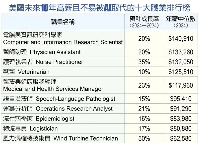 電腦與資訊研究科學家以年薪中位數14萬910美元居首,預計就業成長20%。該職業需從事演算法開發與前沿創新研究,強調抽象邏輯與原創研發能力,被視為最難被AI取代的工作之一。