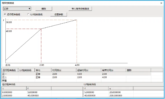 用户可定义程序控制曲线(运行程序曲线、U/f控制曲线),也可自行设置正反转及相应的起始时间与时间长度。