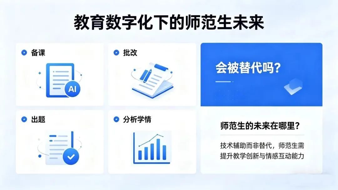 AI能备课、能批改、能出题、能分析学情……教育数字化浪潮之下,很多人都在讨论:会被替代吗?师范生的未来在哪里?