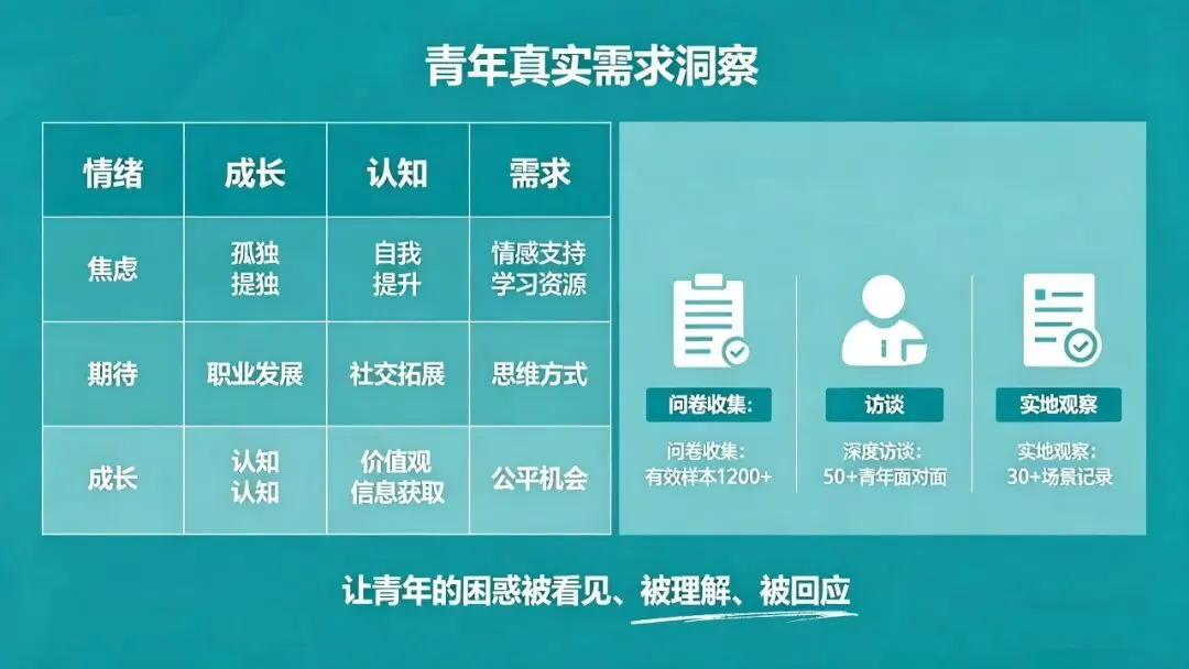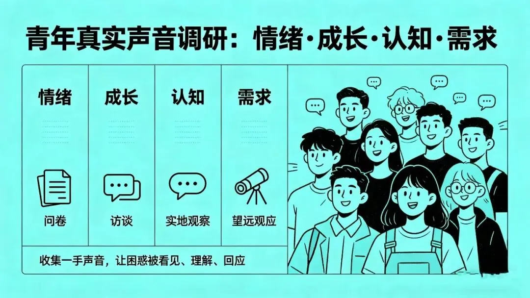 不同于泛泛而谈的行业分析,我们把目光投向“情绪、成长、认知、需求”,用问卷、访谈、实地观察,收集最真实的一手声音,让青年的困惑被看见、被理解、被回应。