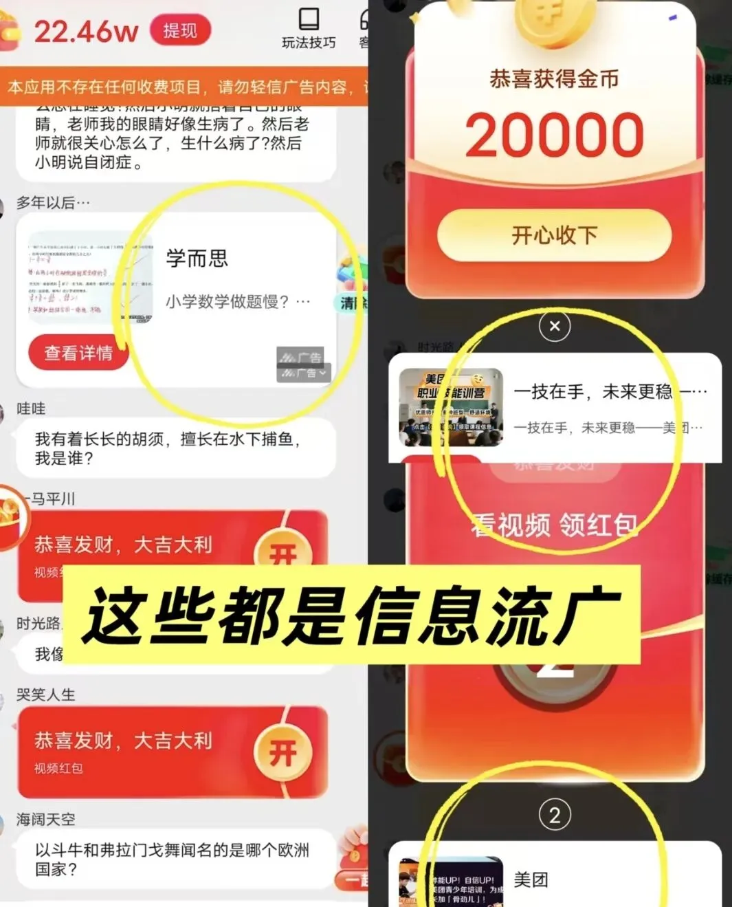 4.红包页面和弹窗底部的信息流广每3-5个点击浏览、互动也可以提高金币收益