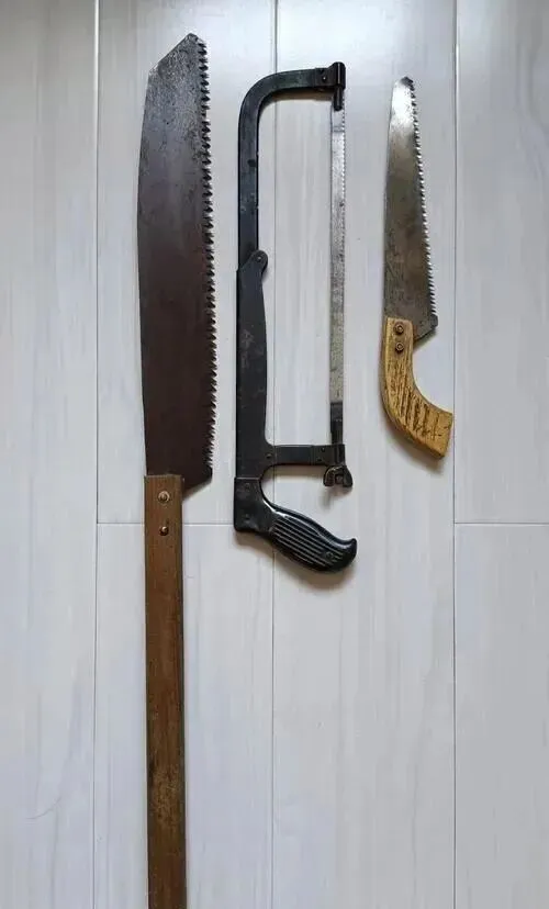 一把、两把、三把,都是木工锯,用铁齿磨得咯咯响,木工师傅家修个门框、做个小板凳谁不会用啊,一长一短别着腰,做事得两个人配合拉锯,锯末像雪一样飘家里会干活的老人总念叨说“锯出来的活结实”,现在定做家具的多,这手劲也就剩下追忆了。