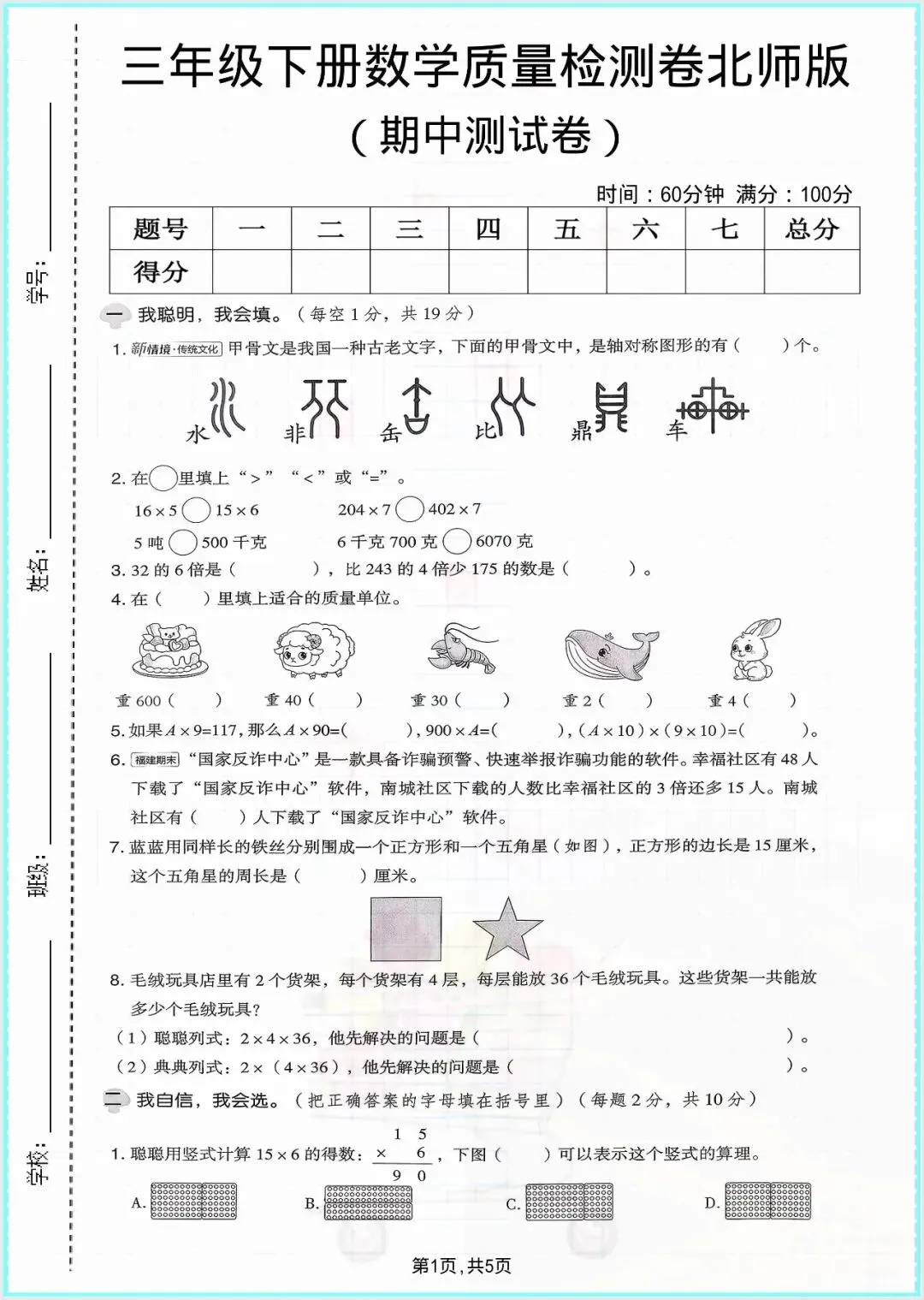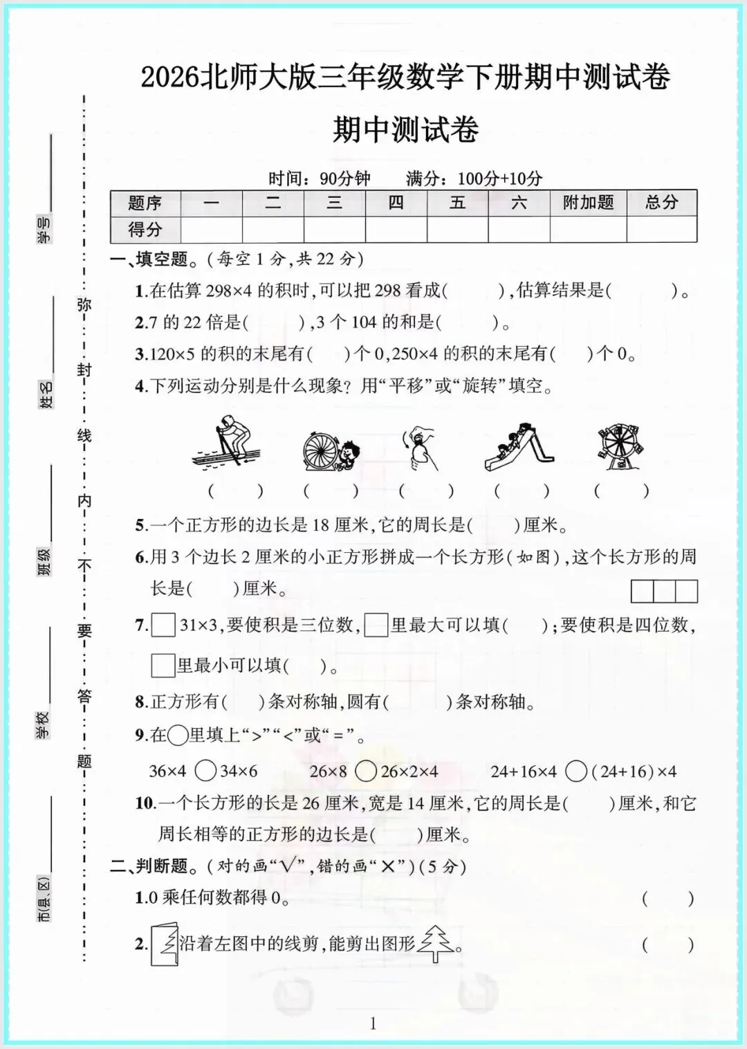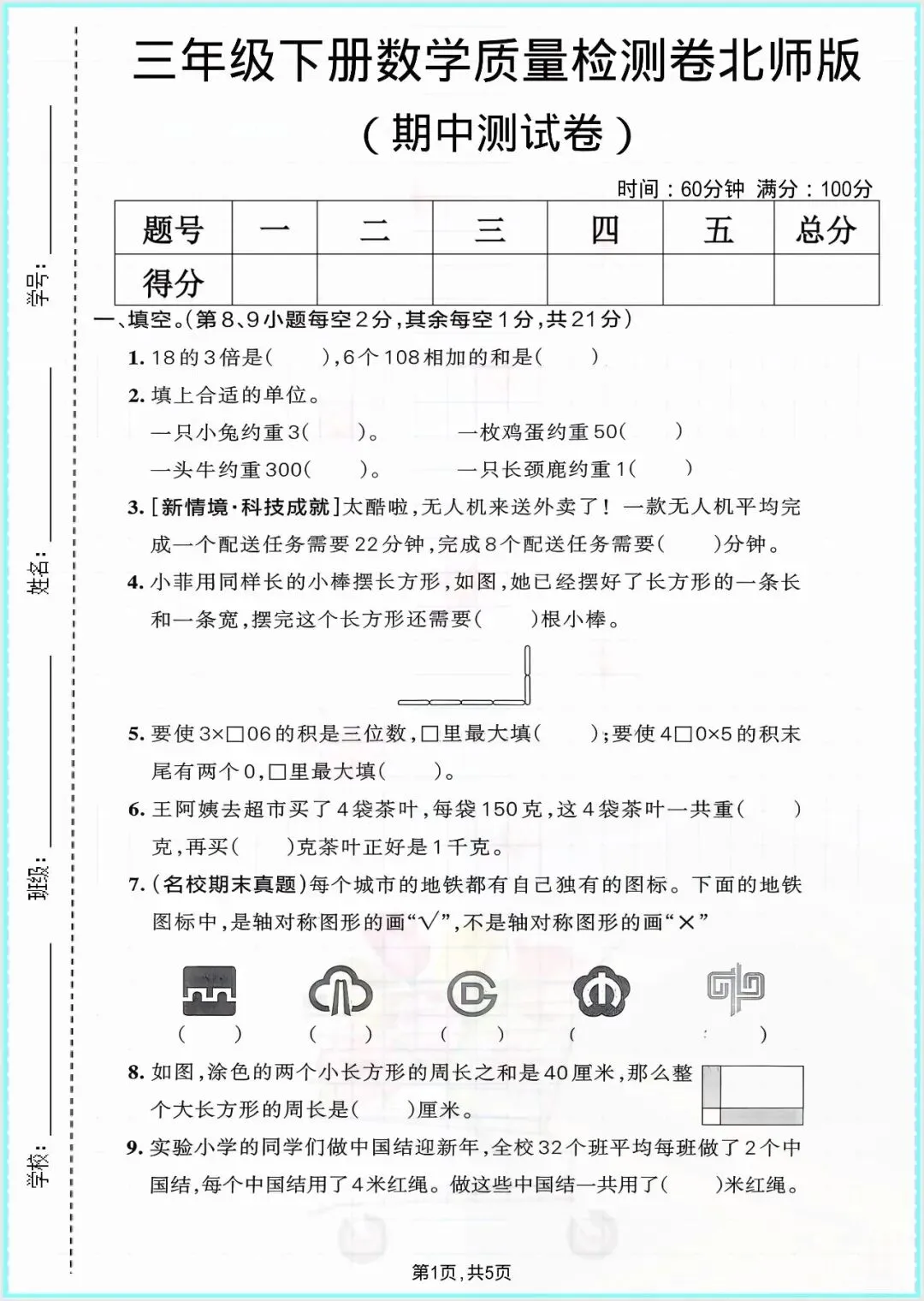 【26年春新版】北师大版数学三年级下册《期中测试卷》含答案,共5套;可打印 大家好,我是冯婉妈妈,今天分享的是;【26年春新版】北师大版数学三年级下册《期中测试卷(一)》含答案,关注我,每天持续分享更多的优质学习资料。 温馨提示;因篇幅有限,仅展示部分内容 (文末有完整版电子版领取方式) 完整电子版: ①:在公众号对话框中回复:4210 (不是在“留言”中发数字)