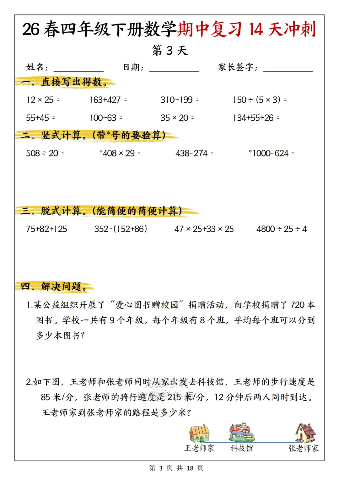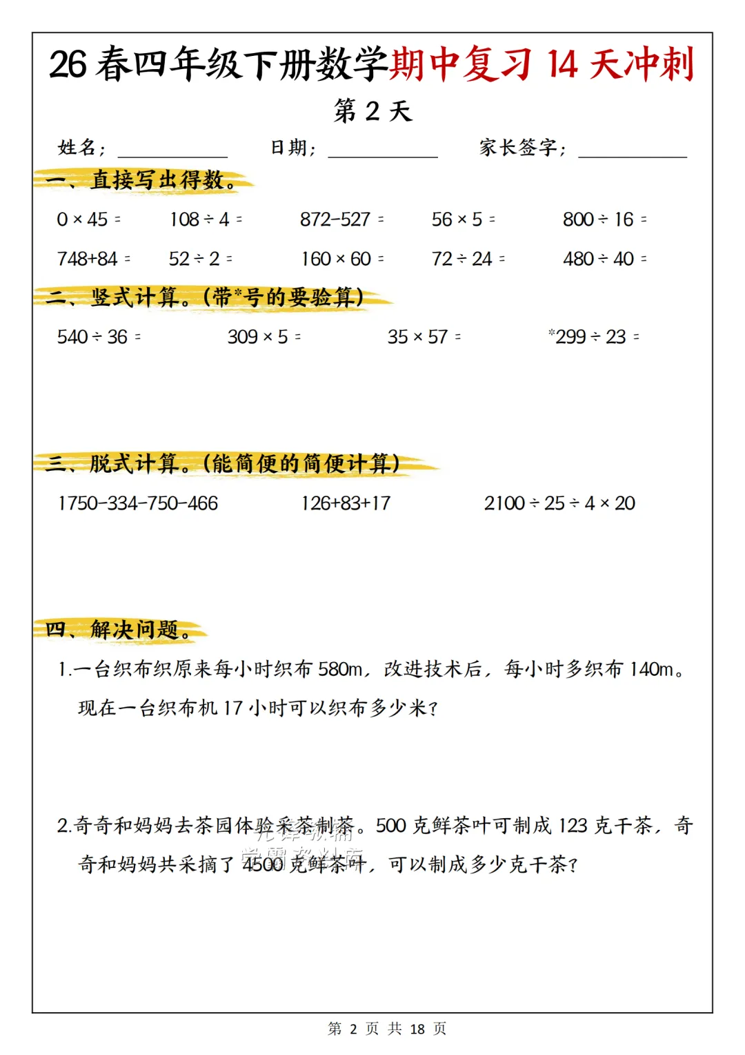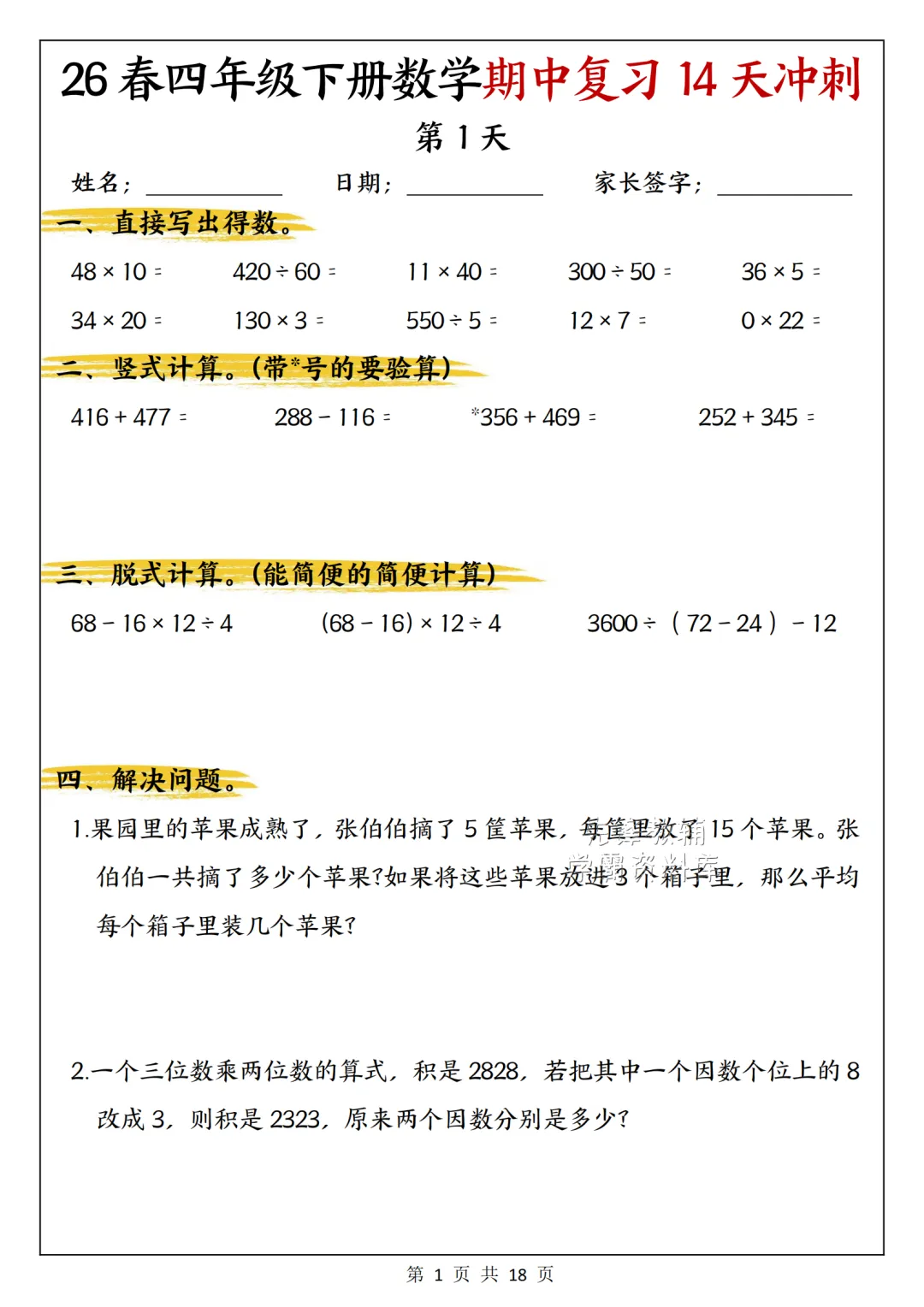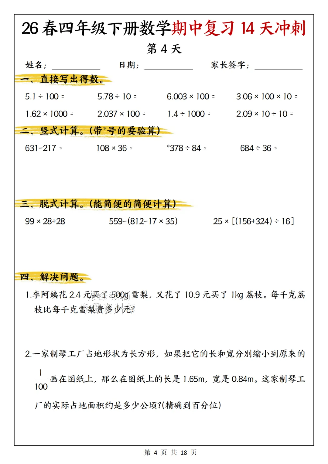 四下数学期中复习14天冲刺|完整版电子版可免费下载打印