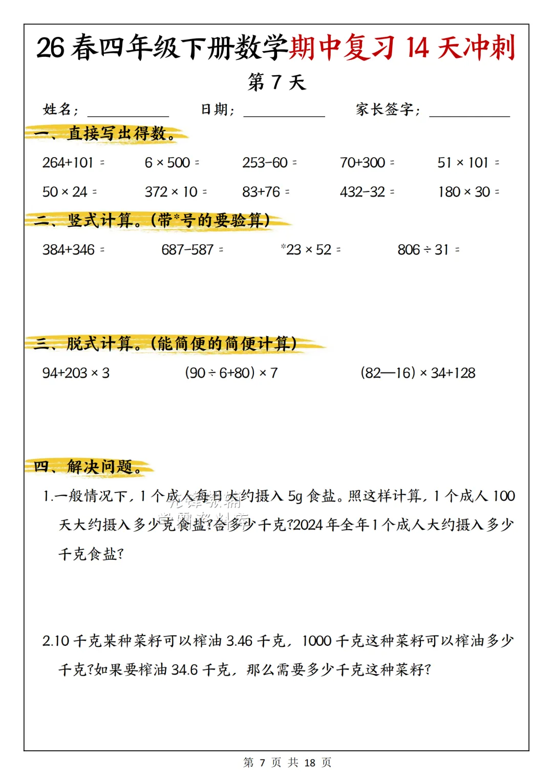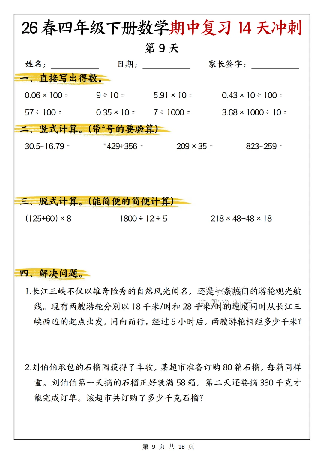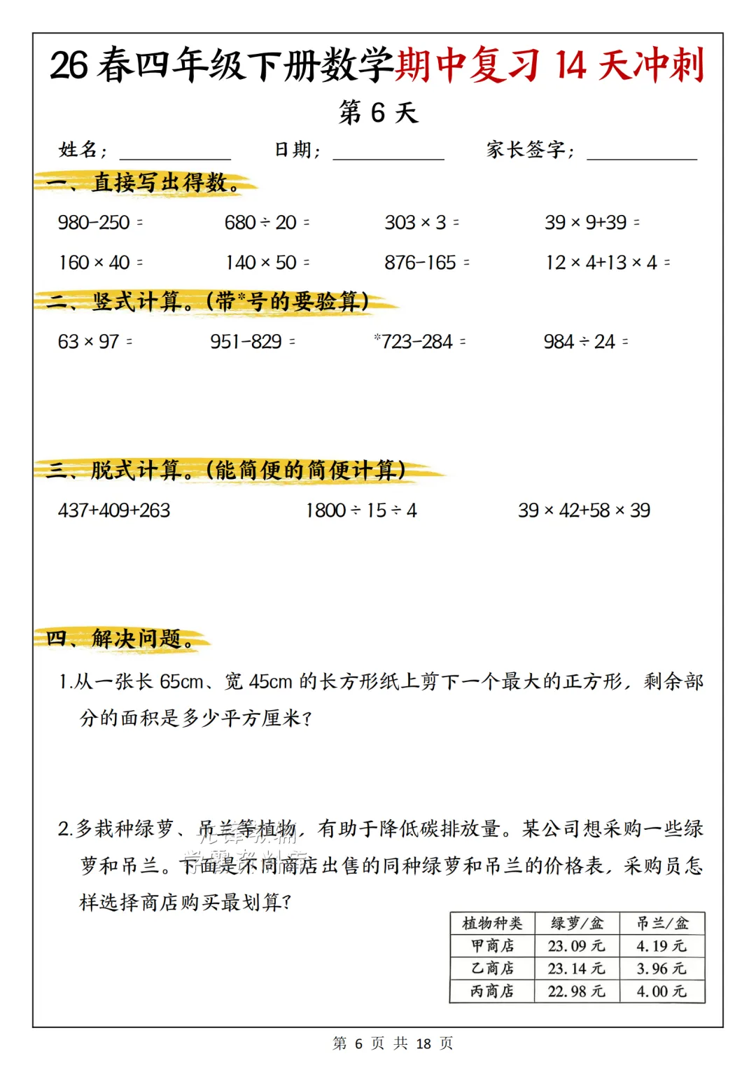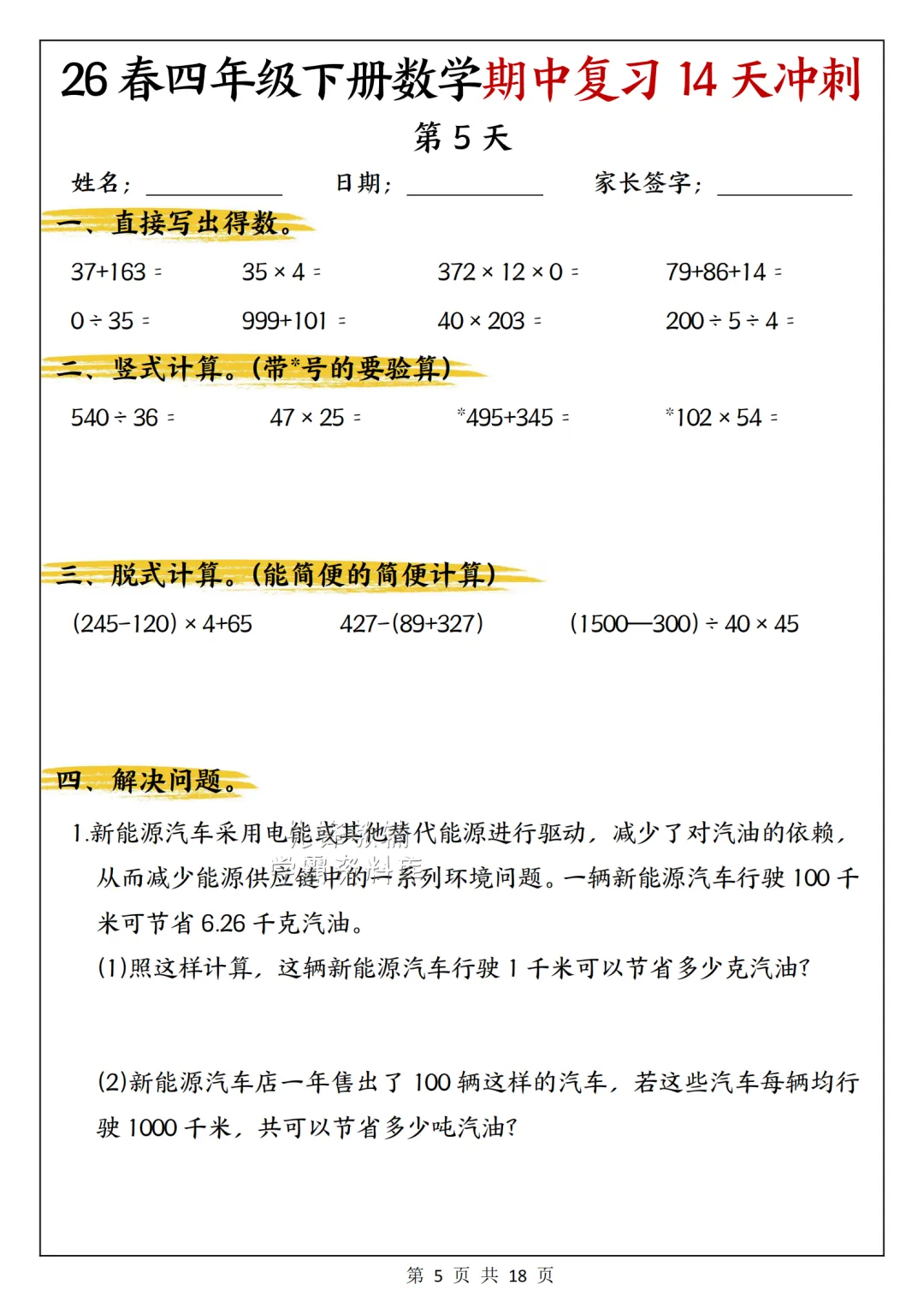 四下数学期中复习14天冲刺|完整版电子版可免费下载打印