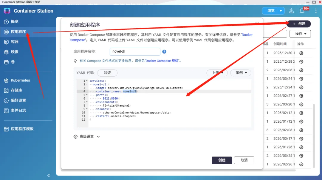 接着打开ContainerStation,把下面的代码进行复制粘贴。