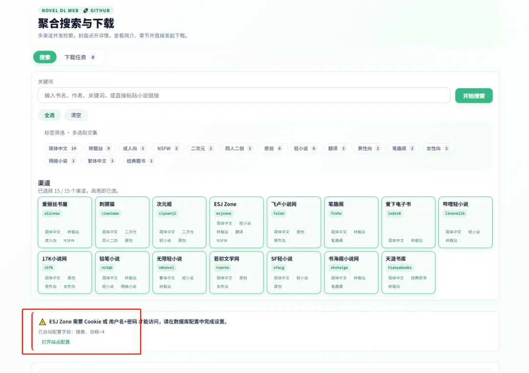 输入小说名或者作者名就可以搜索资源啦。但是会提示进行站点配置。