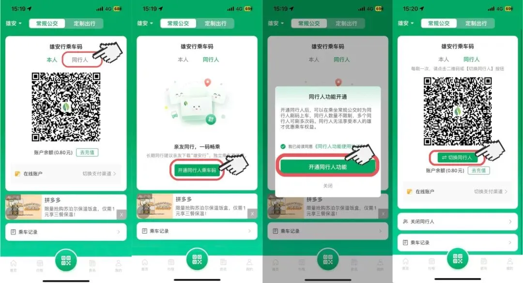 2.操作提示:每为一位同行人刷码后,请点击二维码或【切换同行人】按钮,切换至下一位同行人的乘车码;