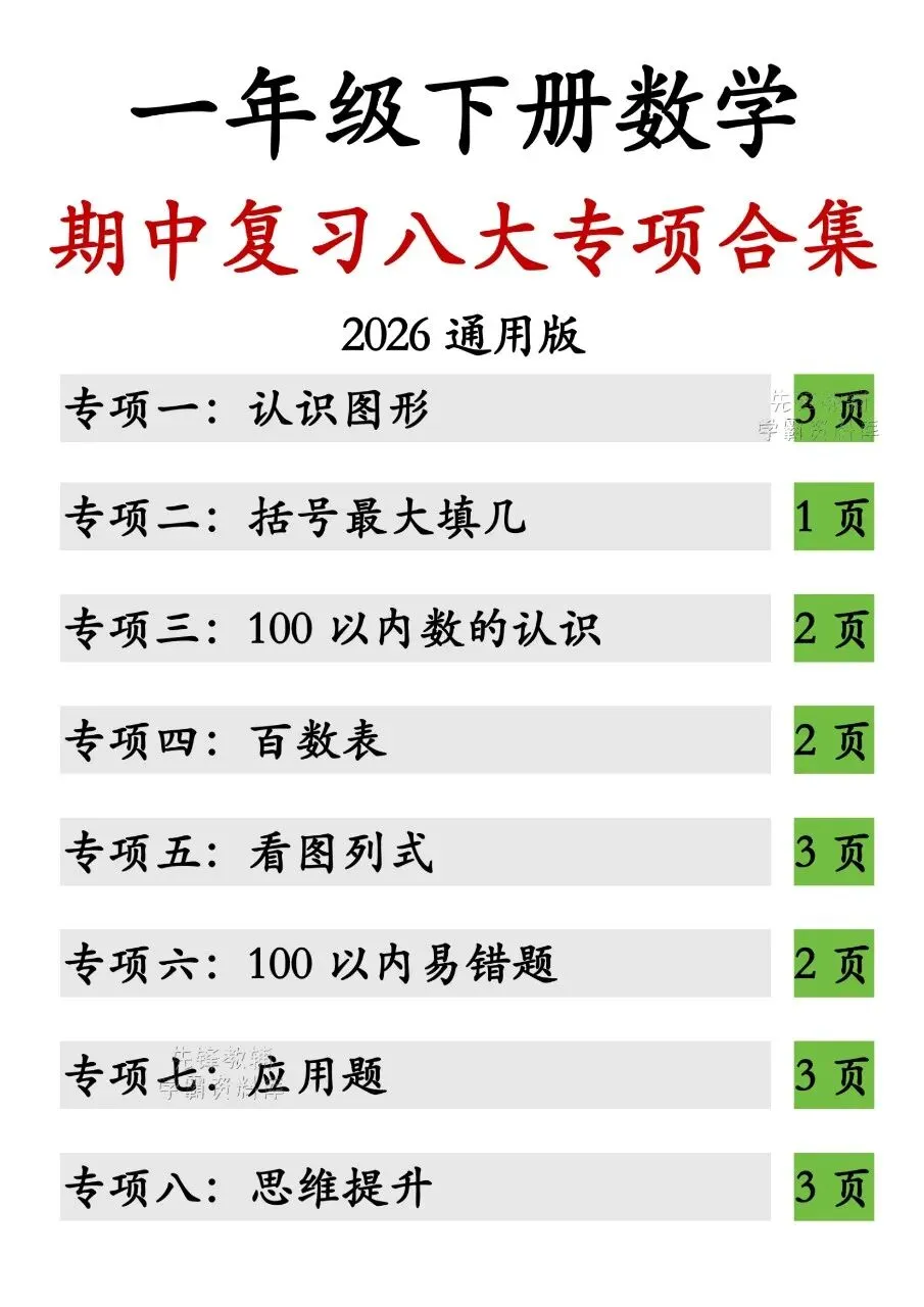 这是一份2026通用版一年级下册数学期中复习八大专项合集,共23页,覆盖认识图形、括号最大填几、100以内数的认识、百数表、看图列式、100以内易错题、应用题、思维提升八大模块,包含基础练习、易错突破与思维拓展,附完整参考答案,适合一年级期中复习使用。