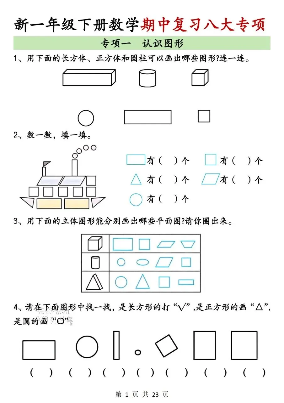 一年级下册数学|期中复习八大专项合集(可下载打印)