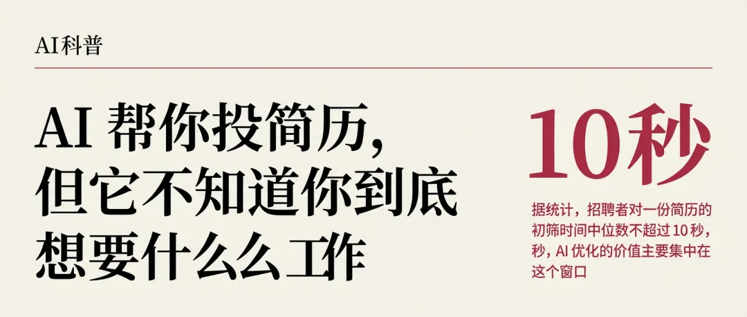 据统计,招聘者对一份简历的初筛时间中位数不超过 10 秒,AI 优化的价值主要集中在这个窗口