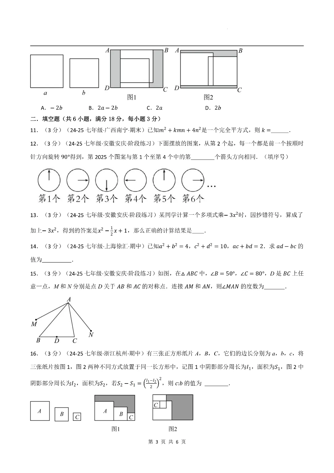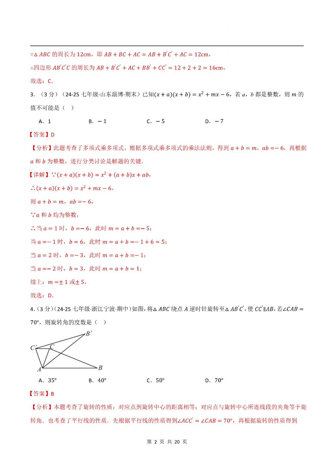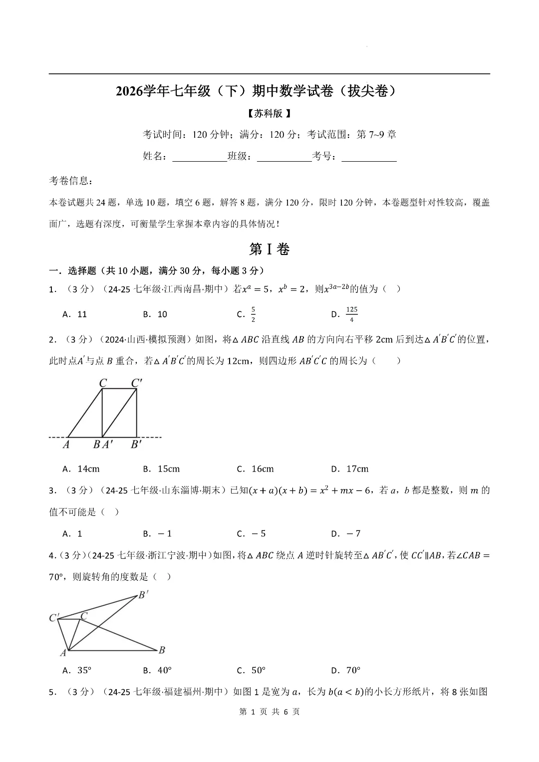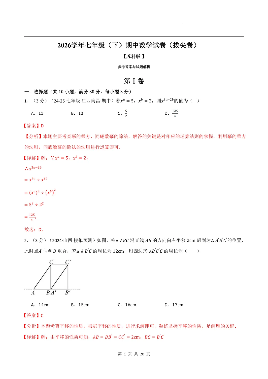 ✨今日给家长朋友们分享的是:2026年春新七年级下册苏科版数学《期中考试拔尖测试卷2套》附答案解析 电子版可打印