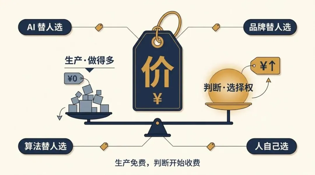 回想最近一次你用 AI 做决定——问它该买哪台车、选哪瓶洗面奶、订哪家餐厅。AI 给完答案之后,如果你没再打开第二个来源验证就直接行动了,判断权就已经悄悄转移了出去。这两年 AI 从帮你省掉写邮件、省掉查资料,直接到省掉做选择。前两件是效率红利,第三件是判断权在易手。AI 把「生产」这件事打到免费,「替谁做决定」这件事开始收费。
