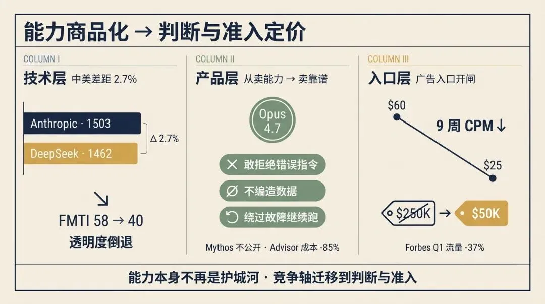 AI 能力本周在三个维度同步打破了”越多越好”的假设。技术维度:中美前沿模型能力差距压缩到 2.7%——”能力本身不再是护城河”。产品维度:Anthropic 把”会拒绝、不编数据、能绕过故障”定价进 Opus 4.7 旗舰卖点,配合 Mythos 不对外开放+Advisor Strategy 让 Haiku 成本降 85%,重新把竞争轴从 benchmark 搬到”生产环境可信赖度”。入口维度:ChatGPT 广告 9 周内 CPM 从 $60 跌到 $25,门槛从 $25 万骤降到 $5 万——品牌触达预算的迁移窗口已经打开。三个案例从宏观估值 → 产品定位 → 入口商业化逐层递进,共同回答一个问题:当”做到”的成本逼近零,AI 产品自己在把卖点从”能力”转向”判断”。