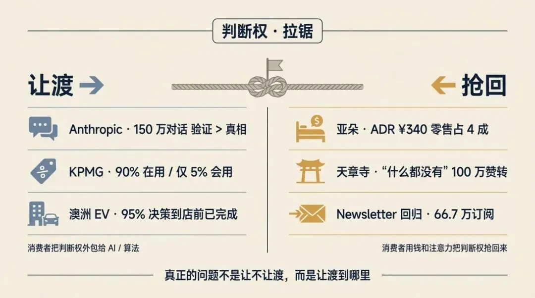 消费者端本周出现一个明显分叉:一边是”让 AI 帮我判断”的行为在加深——Anthropic 自己研究显示 AI 系统性偏好”验证用户信念”(顺着用户观点讨好)而非”说真话”,用户反而更满意;澳洲 EV 市场 95% 决策在到店前已完成。另一边是一批人主动把判断权从算法手里抢回——亚朵卖”平静”、天章寺靠”什么都没有”爆火、Newsletter 回归。三个案例从 AI 端的迎合(现象层)→ 品牌端营销前移动(结构层)→ 消费者主动抢回(反弹层)逐层深入。