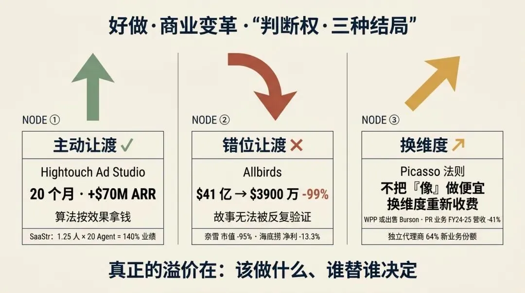 这一层看本周商业变革里谁在涨、谁在跌、为什么。三个案例按「主动让渡判断权获胜 → 让渡到错资产的代价 → 换一个付费维度」递进——共同指向一件事:赢家重新决定了”该做什么、谁替谁决定”,而不是在同一个维度里做得更多。