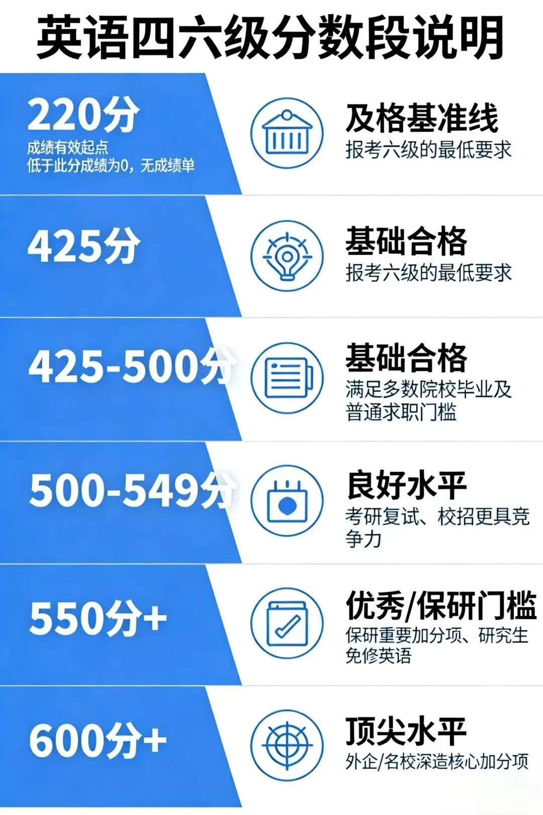 – 官方无及格线;全社会通用硬线:425分(四级过线才能报六级、毕业/求职基础门槛)