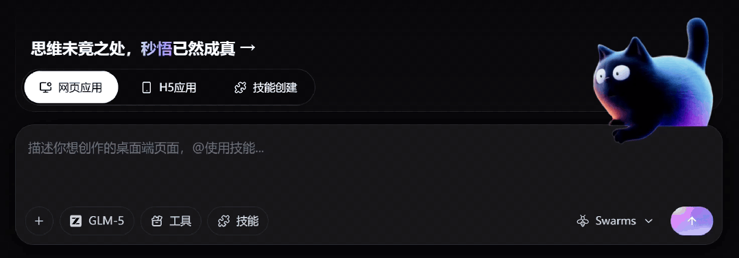 试想一下,你上一秒还在用大白话跟秒悟聊个需求,下一秒,一个带有漂亮UI、有真实数据库交互、能够抗住一定并发访问量的网页链接,就已经生成在你的对话框右边了。