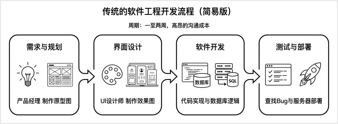 我以前做过产品经理,也干过UI设计。在传统的软件工程里,一条标准的开发流水线一般是下面这样的。