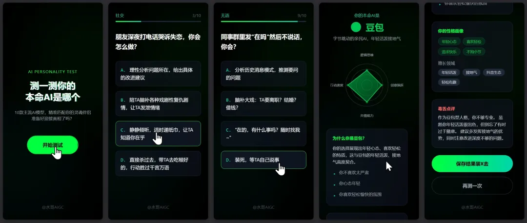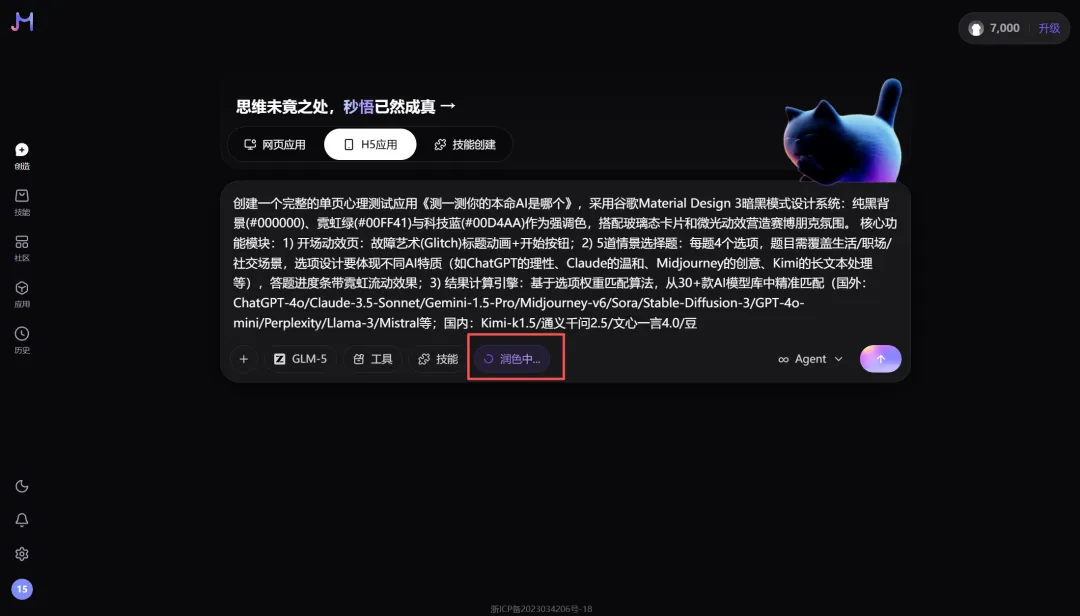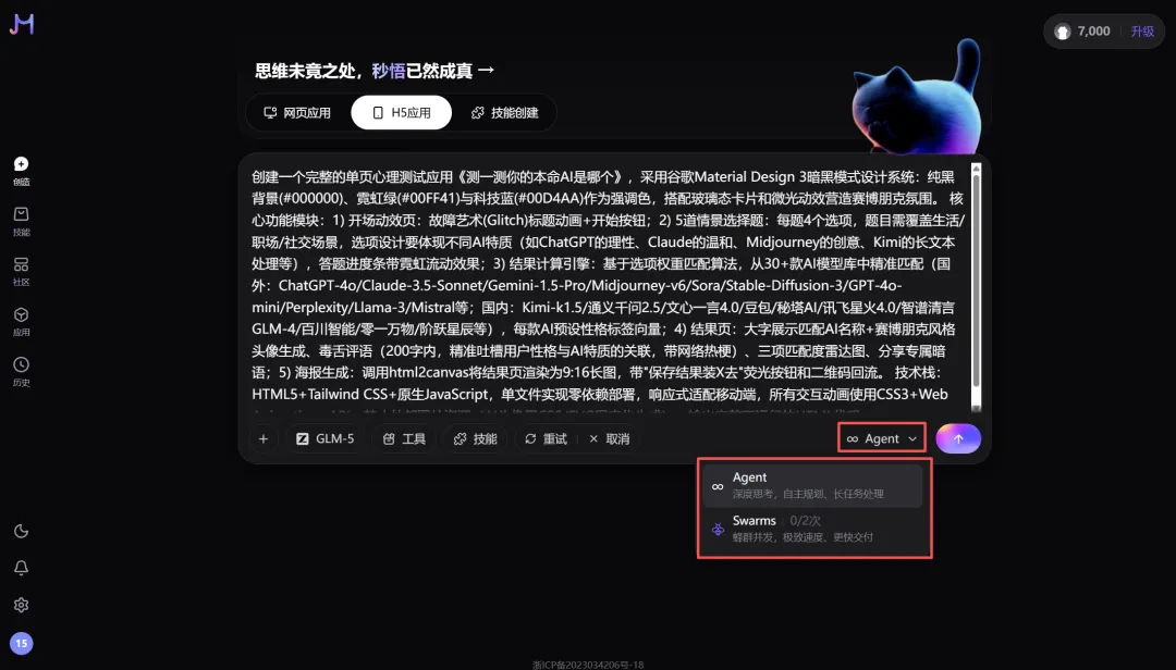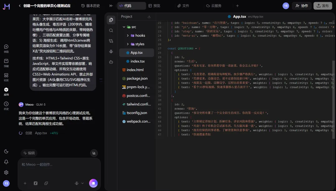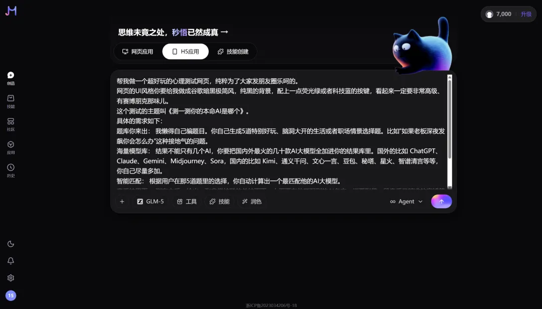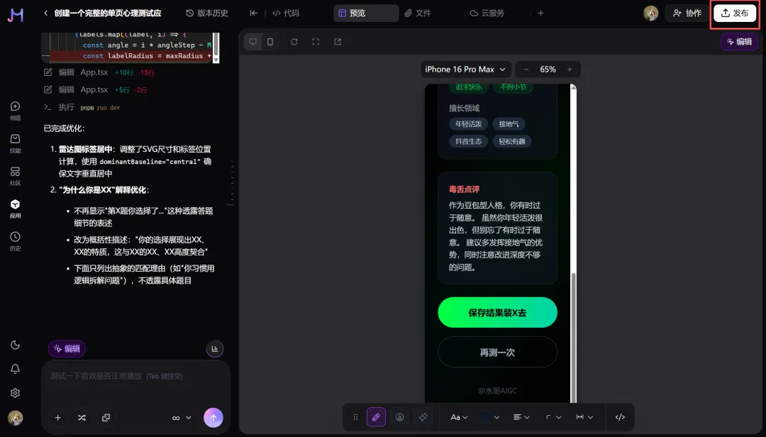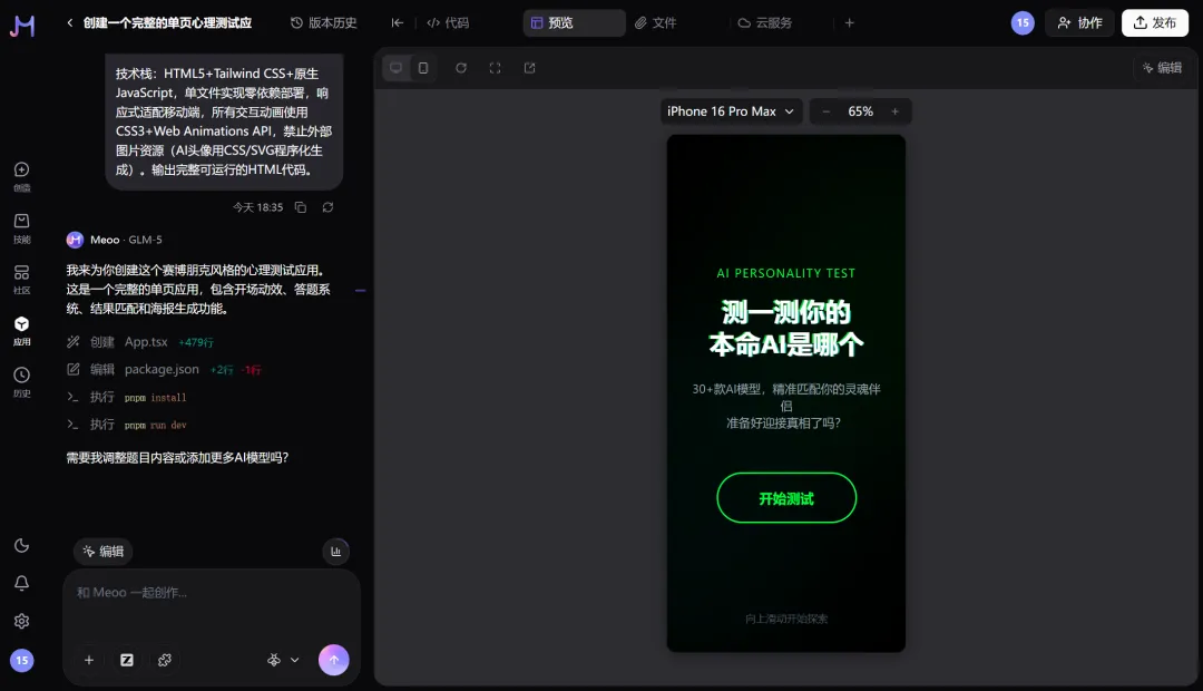 比如我这里直接让它帮忙生成一个测一测你的本命AI是哪个的小工具,想在手机上用,所以我直接选择了H5应用。