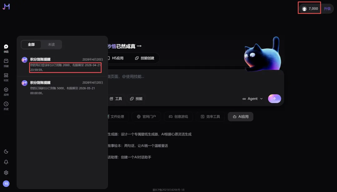 每天登录就送2000积分,新用户注册还额外送5000积分,这算力足够我们好好体验一番了。