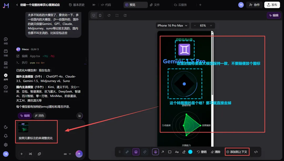 比如我框选了结果页的海报,直接说这里的图标要跟大模型保持一致,不要随便放个图标,然后点击添加到上下文,这张带有文字标注的图片就自动加到对话框上了。