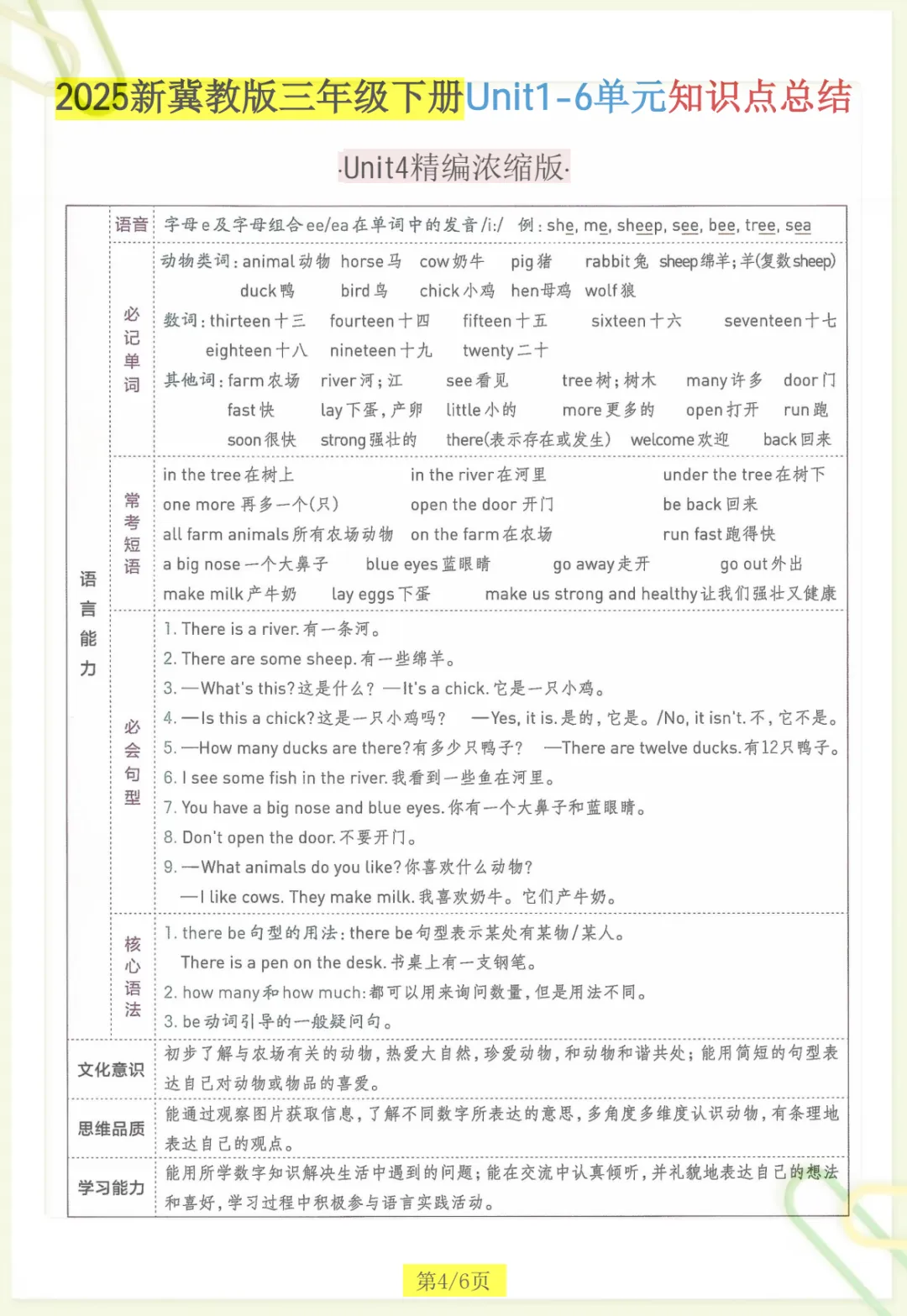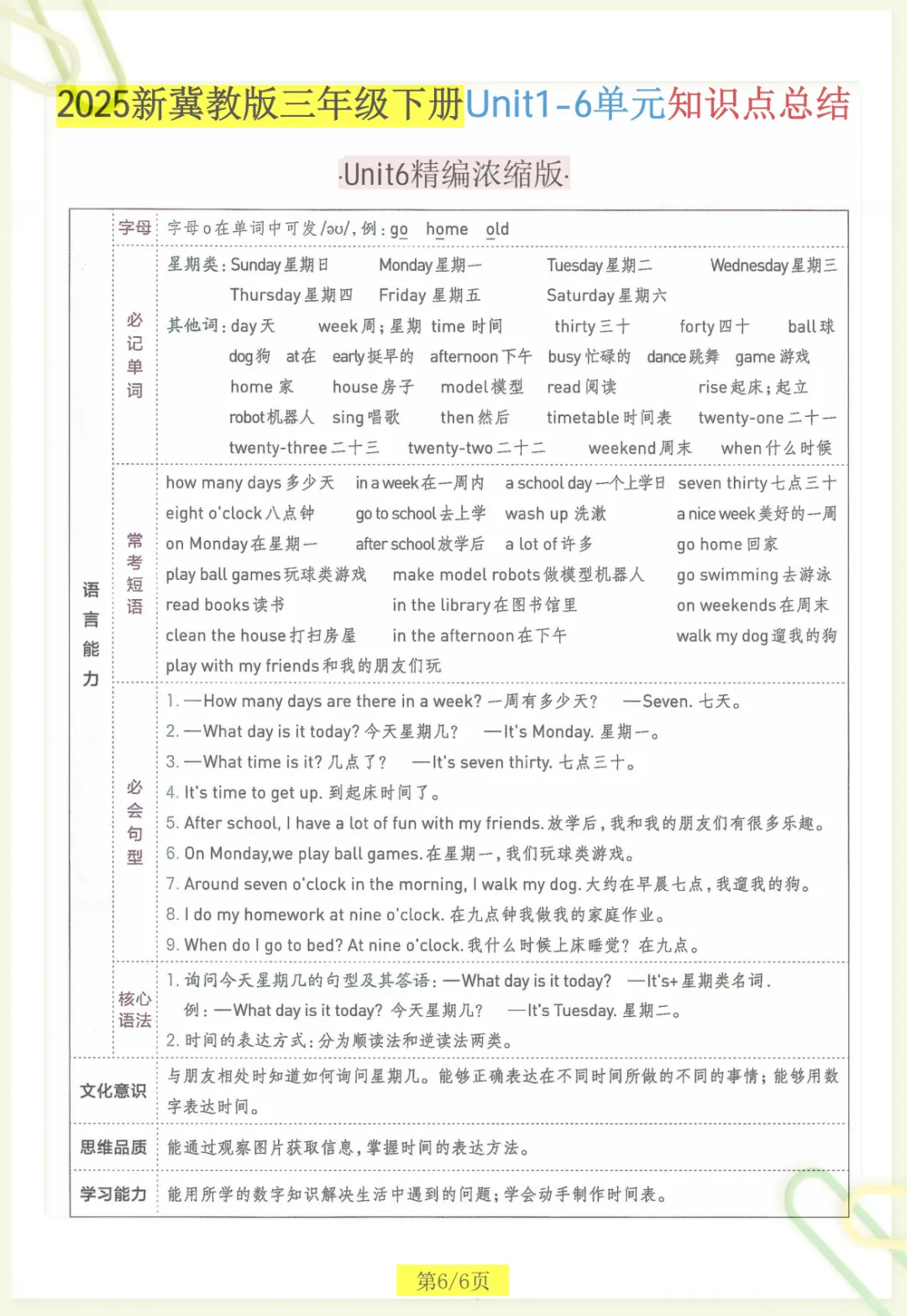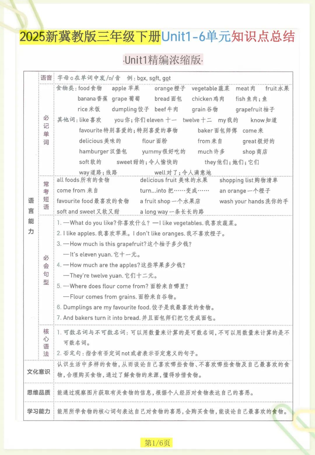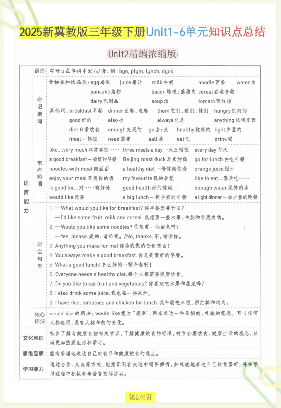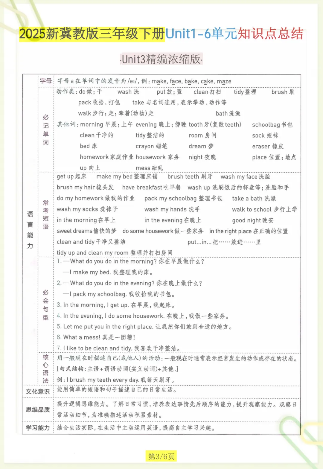 三年级下英语知识点总结《冀教版》,共6页,电子版可下载可打印,这份资料紧扣三年级下册英语学习内容,帮助孩子对课内重点进行系统梳理与归纳,涵盖多个核心知识点与专项训练内容,便于孩子在课后复习、查漏补缺、巩固基础。内容精炼实用,家长可以根据孩子的学习进度随时下载打印,让孩子练一练、记一记,更高效地掌握本学期英语重点。