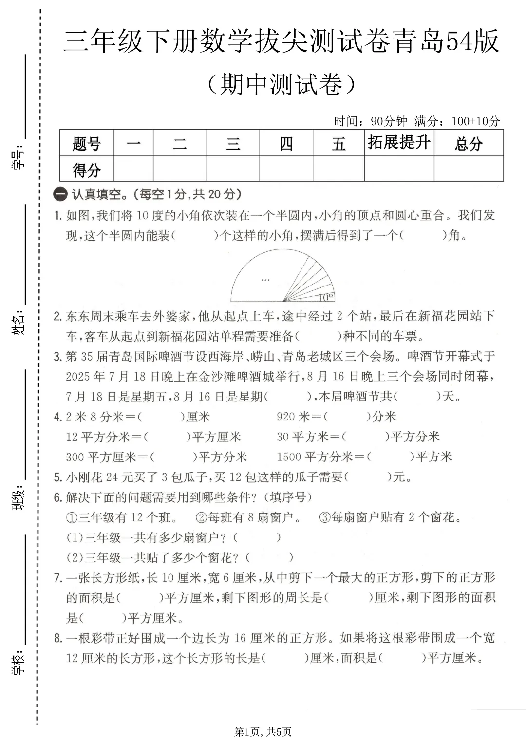 今天给家长们分享的是:2026年春新三年级下册青岛54版数学《期中考试拔尖测试卷4套》附答案解析‖高清电子版可打印