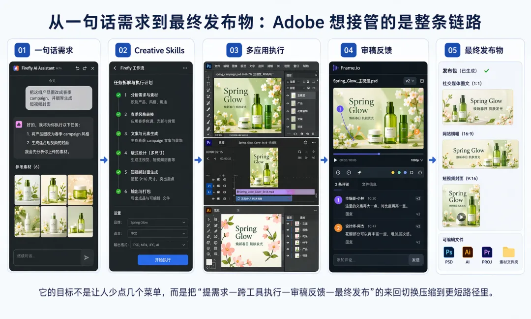 它会把 Firefly、Photoshop、Premiere、Lightroom、Express、Illustrator 等能力集中到一个统一的对话界面里,用户描述结果,系统去编排过程。