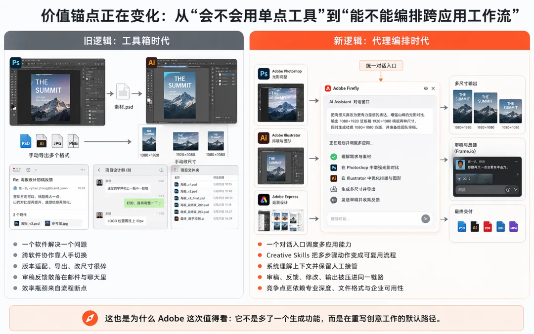 所以 Adobe 这次的动作,才显得格外有代表性。它没有停留在“再发一个生成式按钮”的层面,而是直接提出一个更大的方向:让创意软件从工具箱,走向代理。