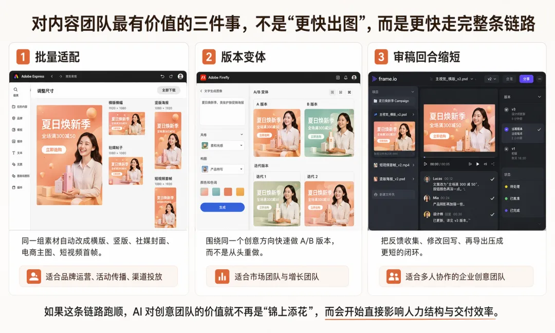 这也是为什么很多轻量 AI 创意工具很容易爆红,但真正想吃下企业创意流程,最后还是会回到文件、流程、权限和协作这些“看起来不性感,但真正难替代”的东西上。