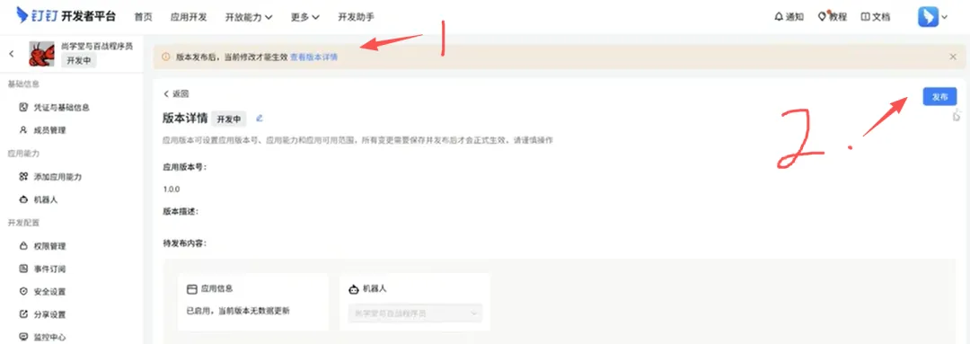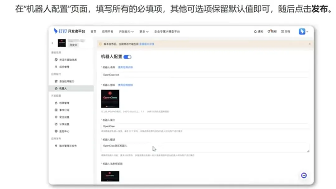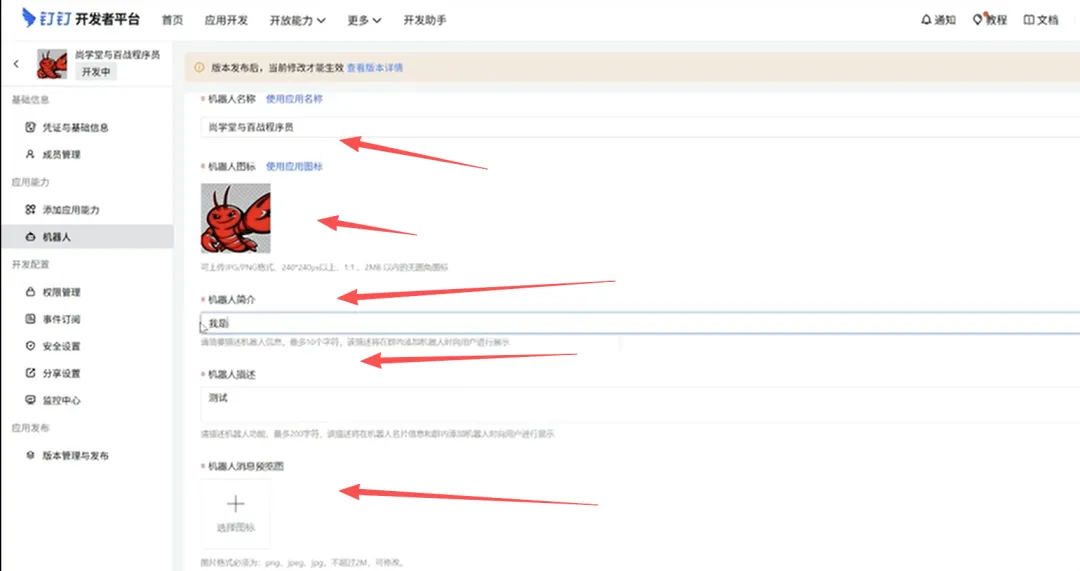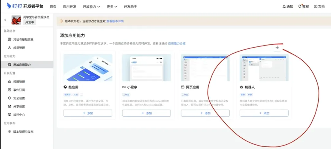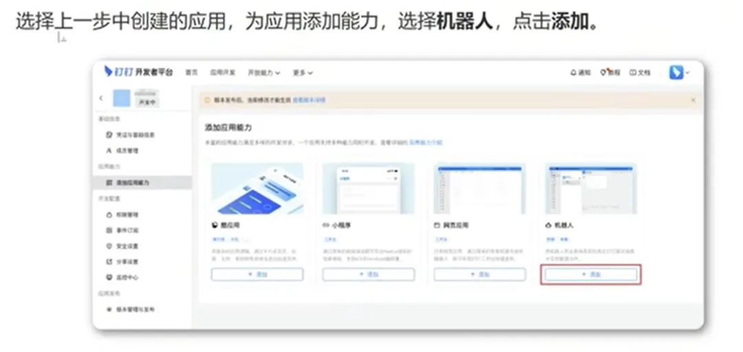 应用创建完成后,需要为应用添加机器人能力,才能实现自动对话: