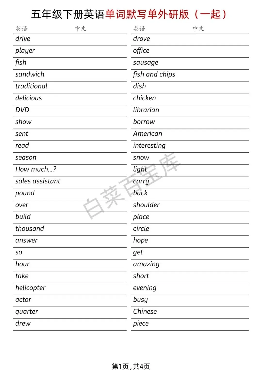 五年级下册外研版(一起)英语《单词默写单中英文互译》,电子版可下载可打印