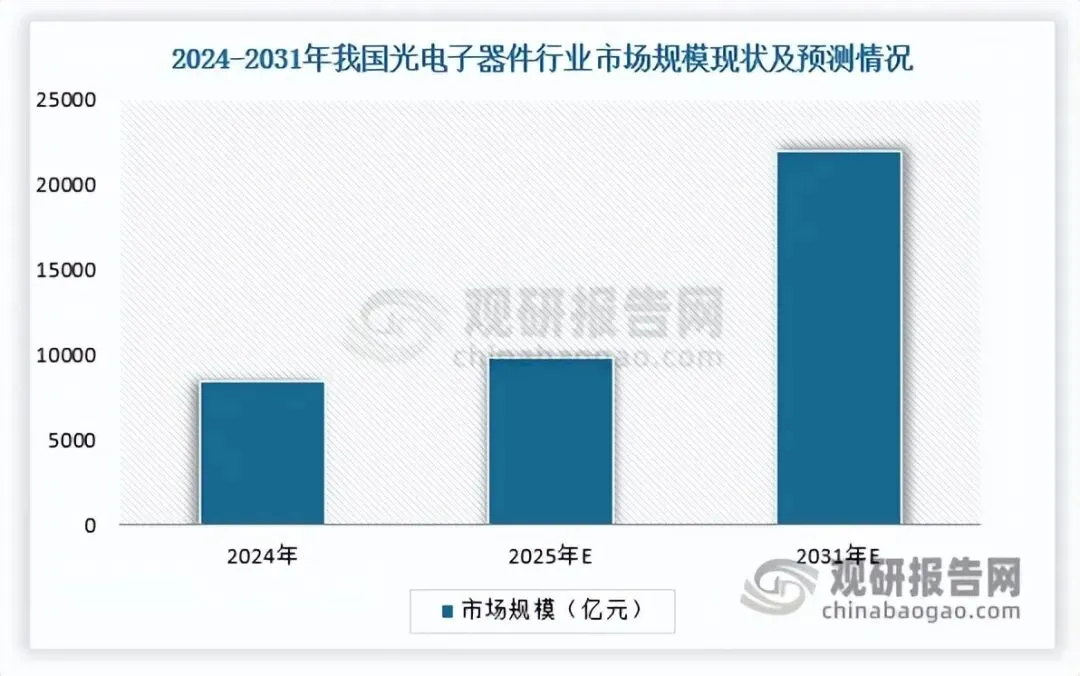 因此,在上述因素驱动下,我国光电子器件行业市场规模高速增长。数据显示,2024年中国光电子器件市场规模达8500亿元,同比增长12%,占全球份额超30%;受益于AI数据中心、激光雷达等新兴需求拉动,预计2025年国内市场规模将突破9800亿元,2025—2031年复合增长率维持在14%—16%,2031年市场规模有望达到2.2万亿元。