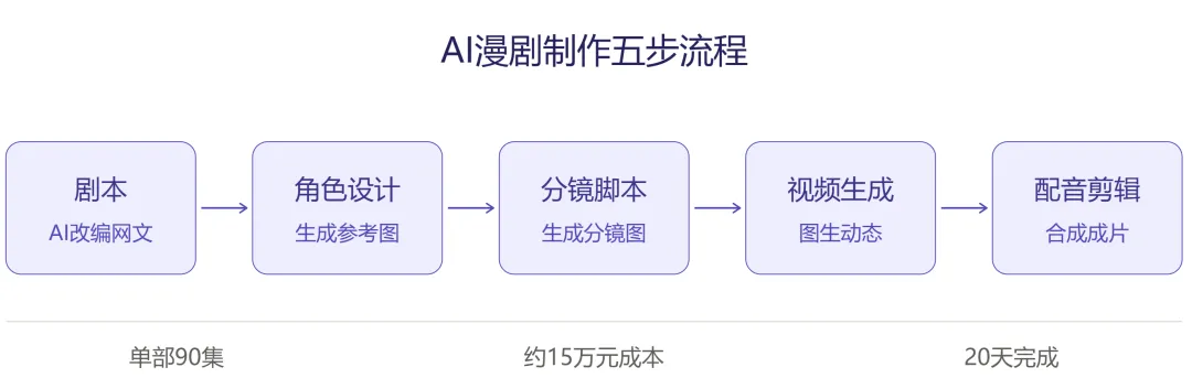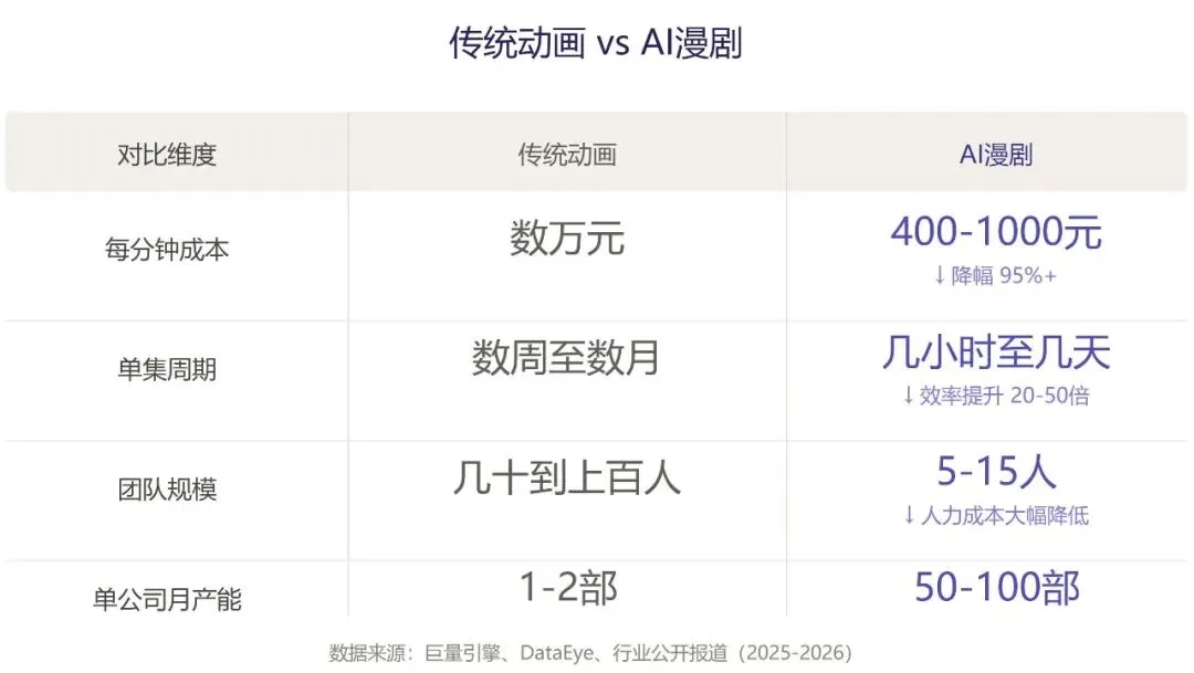 它和传统动画最大的区别是:传统动画是一帧一帧画出来的,AI漫剧是一张一张生成出来的。一部《你的名字》需要上百个动画师花几年时间绘制几万张原画,一部AI漫剧只需要十几个人用20天做50集——成本从传统动画的每分钟数万元,降到现在的每分钟几百元。