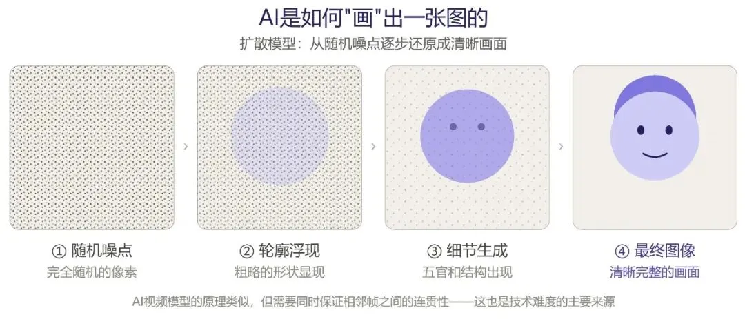 现在主流的AI生图(和生视频)用的是一种叫”扩散模型”的技术。打个比方:你有一张清晰的照片,把它泡在水里搅一搅,像素开始模糊;再搅,完全变成一团噪点。扩散模型做的事情是反过来——给它一团随机噪点,它一步步”去噪”,最后还原出一张清晰的图片。训练的时候,模型看过几十亿张图片和对应的文字描述,学到了”当你给我’少女在樱花树下’这样的描述时,应该从噪点里收敛到什么样的画面”。