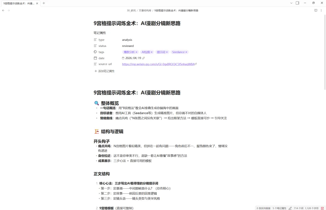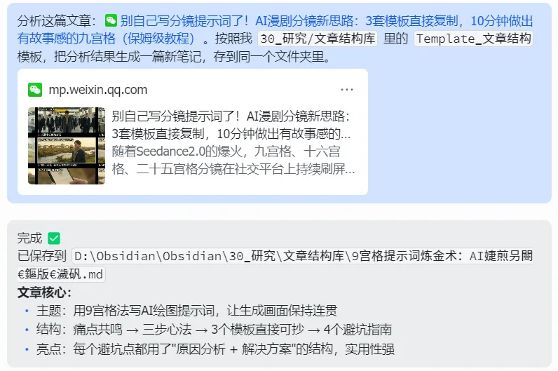 效果:30秒后,你的 Obsidian 里多了一篇结构清晰的分析笔记。以后写类似选题时,直接打开参考