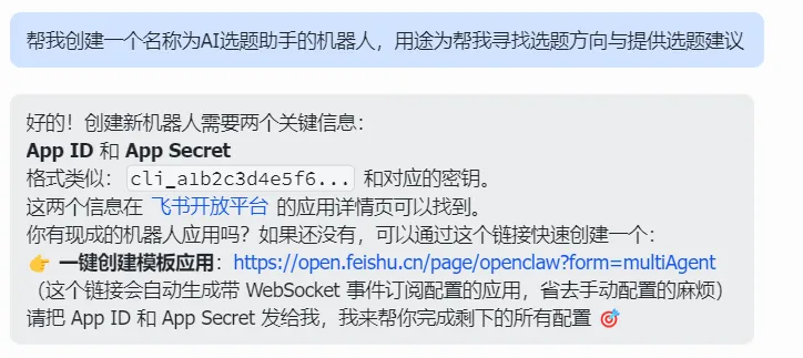 第二步:告诉他名称,用途,龙虾会带着你一步一步去创建