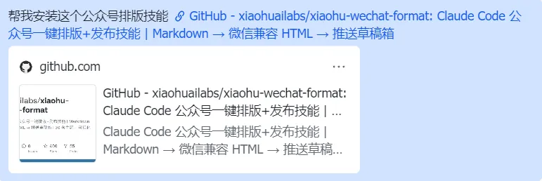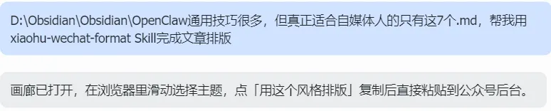 “帮我用xiaohu-wechat-format Skill完成文章排版+【你的文章地址】”