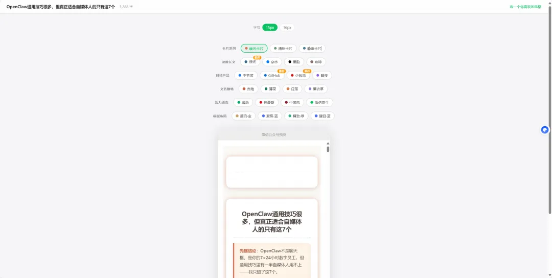 排版比写文章累——选模板、调样式、一张张传图、一遍遍预览,一篇稿子排版半小时起步。