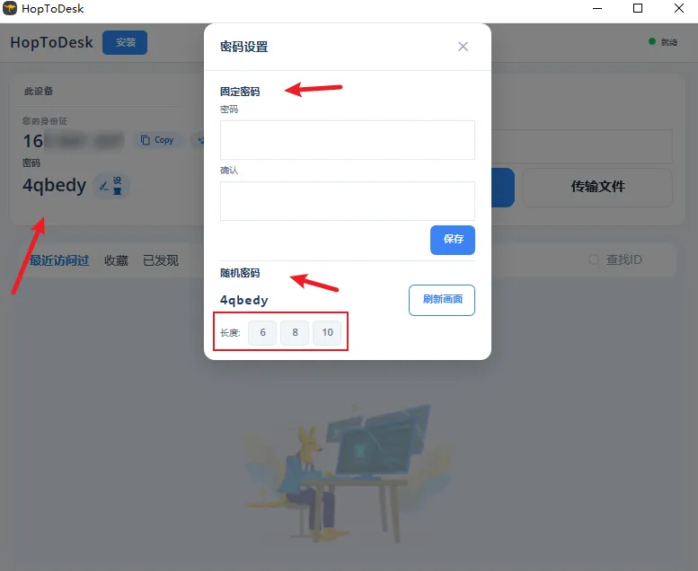 还有个功能也是十分的强劲,就是那个文件传输,以前在两台电脑之间传东西,还得用微信或者是网盘倒腾半天,麻烦得要死,现在有了这个,你直接把文件拖进窗口就行,就像在你自己电脑上操作一样顺滑,而且速度也不慢,对于经常需要拷文件回家的打工人来说,简直是太方便了,省事不少。软件的密码可随机也可设置固定,如下图所示。