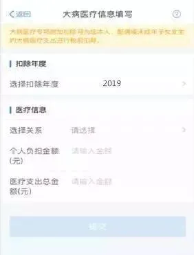 3.选择扣除年度、与纳税人的关系,据实录入个人负担金额以及医疗支出总金额,点击【提交】即可。